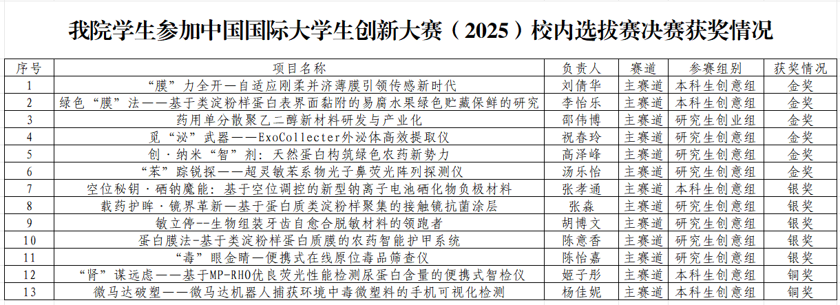 为深入落实习近平总书记关于教育的重要论述和习近平总书记给中国国际大学生创新大赛参赛学生代表的回信精神,提升大学生创新创能力、培养大学生创新创业素养,学校于3月至5月成功举办中国国际大学生创新大赛(2025)校内选拔赛。