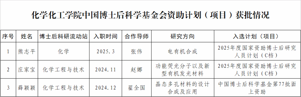 化学博士后科研流动站熊志平博士后、化学工程与技术博士后科研流动站庄家宝博士后获批2025年度国家资助博士后研究人员计划(C档),天使动漫