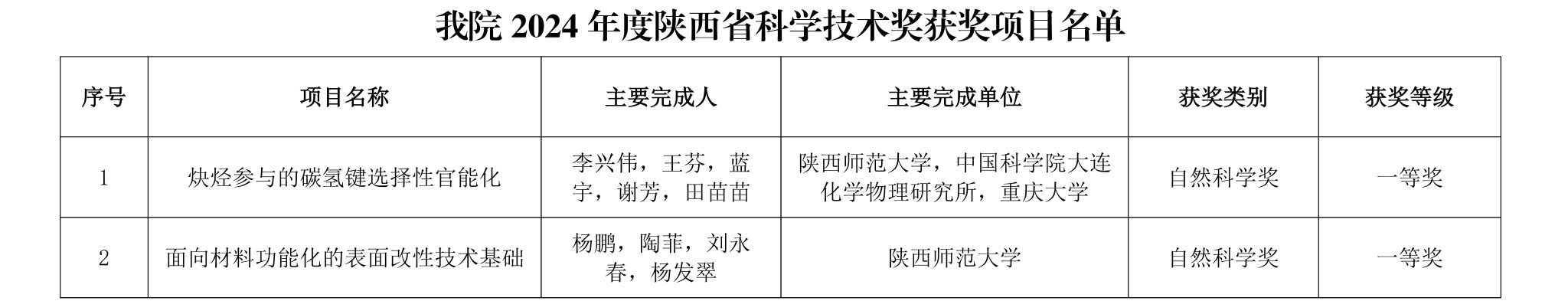 李兴伟教授团队的“炔烃参与的碳氢键选择性官能化”成果和杨鹏教授团队的“面向材料功能化的表面改性技术基础”成果获陕西省自然科学奖一等奖。这是近年来天使动漫