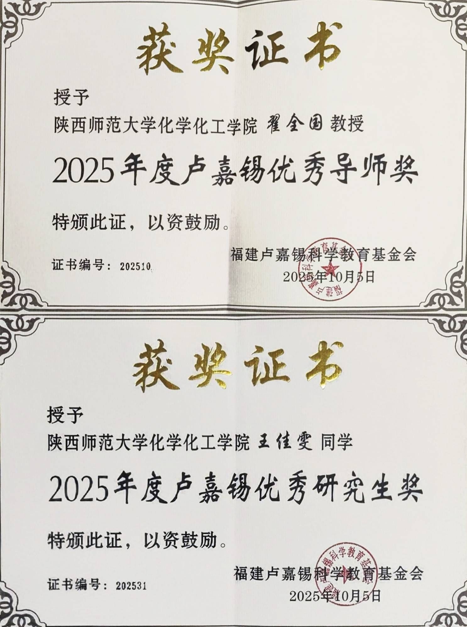 翟全国教授获得2025年度卢嘉锡优秀导师奖、2023级博士研究生王佳雯获得2025年度卢嘉锡优秀研究生奖。