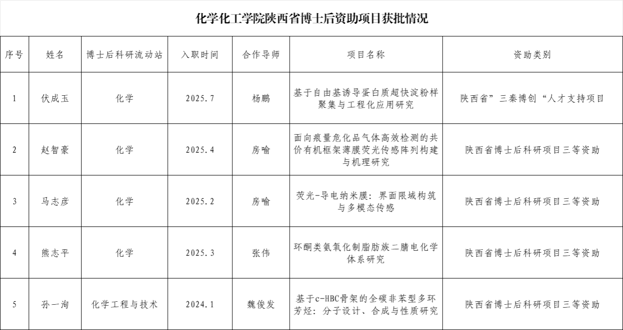 化学博士后科研流动站伏成玉博士后入选2025年陕西省“三秦博创”人才支持项目。