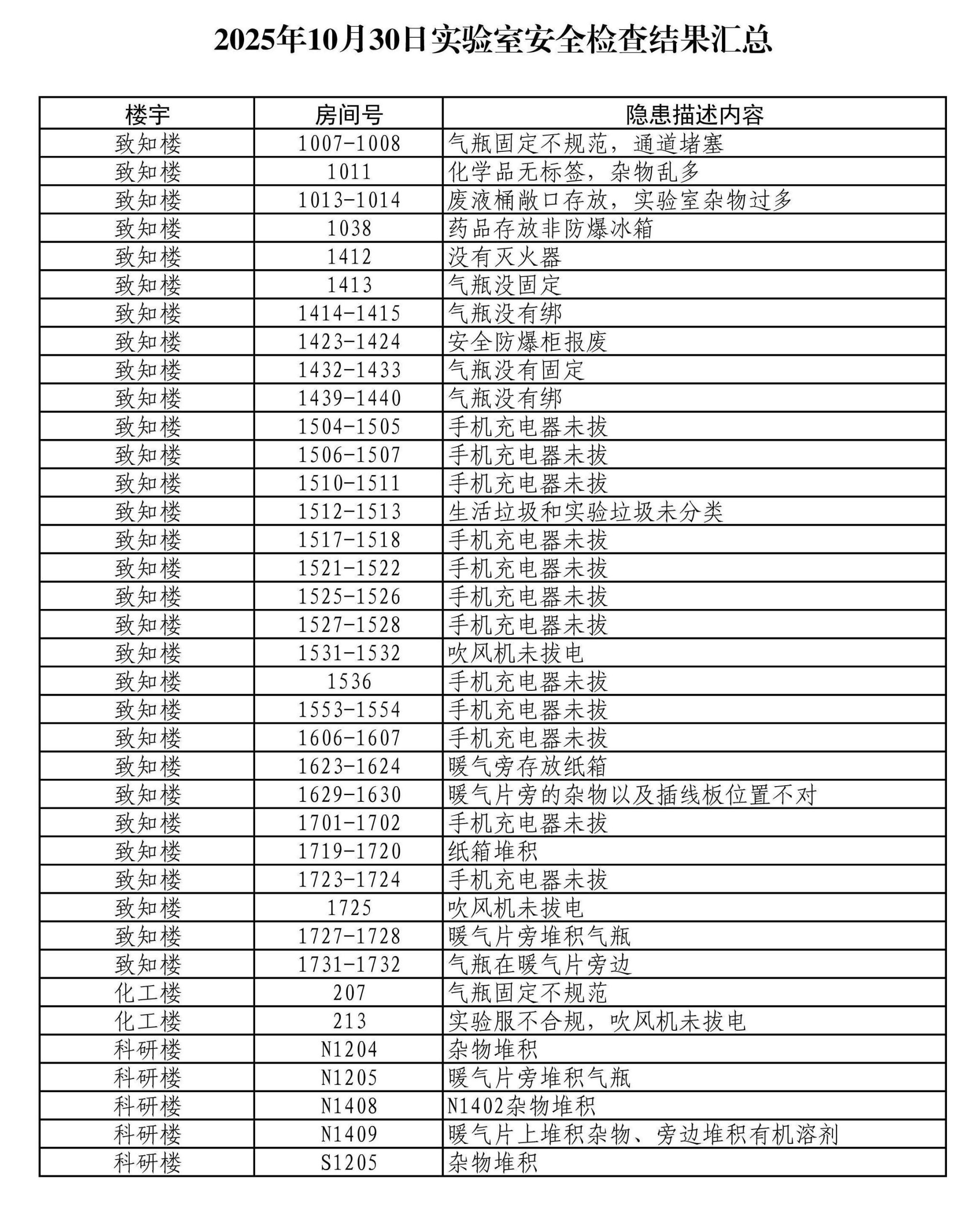 本次安全检查发现的安全隐患主要集中在设备安全和环境卫生等方面,有多个实验室存在手机充电器未拔、小电器不断电、杂物堆积、暖气旁堆放杂物等安全隐患问题。