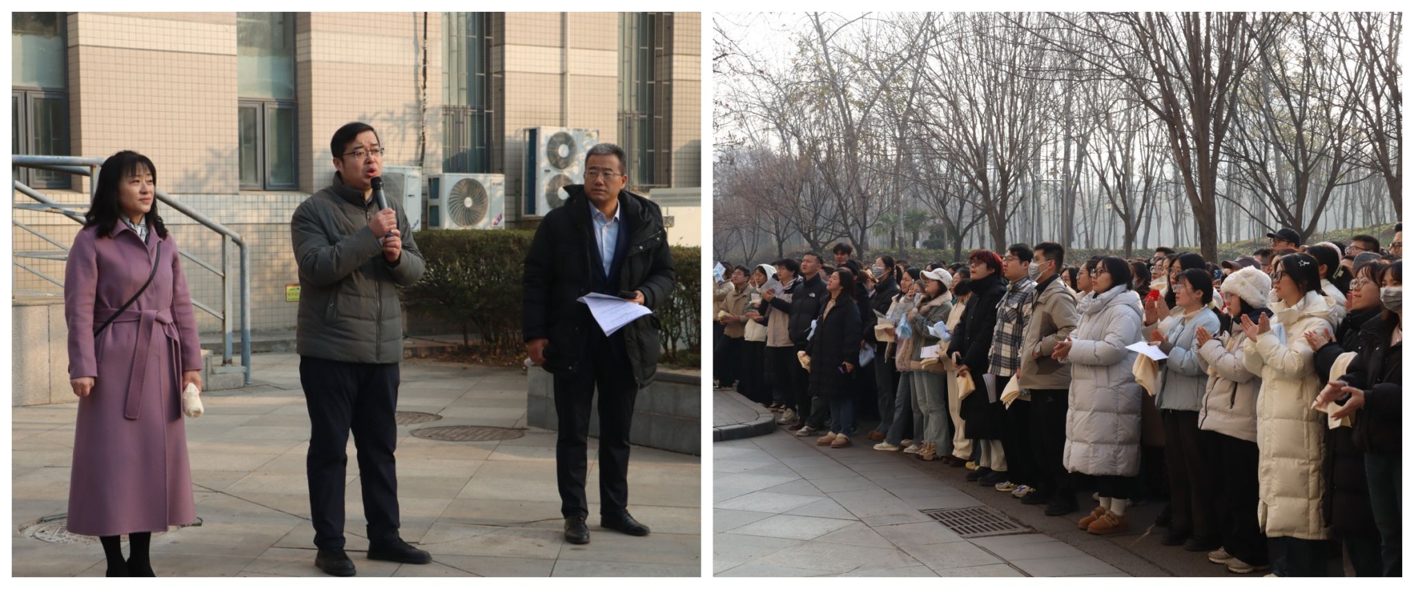 本次活动分阶段有序推进。上午7:00,工作人员在致知楼南门通过二维码精准统计入场人员,同步发放消防安全物资,为演练顺利开展奠定基础。9:30,总指挥肖新军发布应急疏散指令,各楼层迅速启动烟雾发生器并拉响警报,应急疏散环节全面展开,引导师生员工采取“打湿毛巾、捂住口鼻、弯腰靠右、有序下楼”的科学逃生方式撤离。整个疏散过程高效有序,仅用时4分53秒,共安全疏散人员818名。