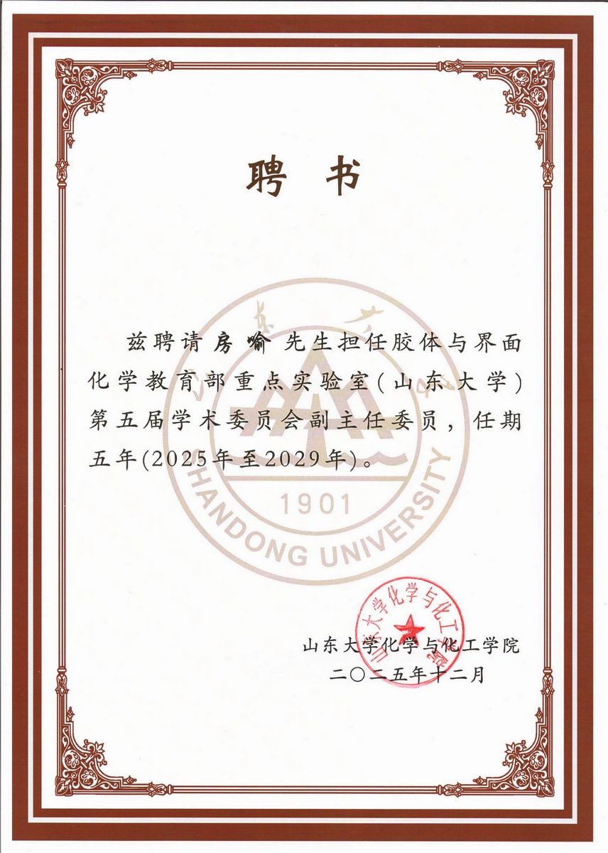 12月21日,房喻院士应邀赴济南市出席在山东大学召开的胶体与界面化学教育部重点实验室第五届学术委员会第一次全体会议,并获聘担任胶体与界面化学教育部重点实验室(山东大学)第五届学术委员会副主任委员,任期五年(2025年至2029年)。