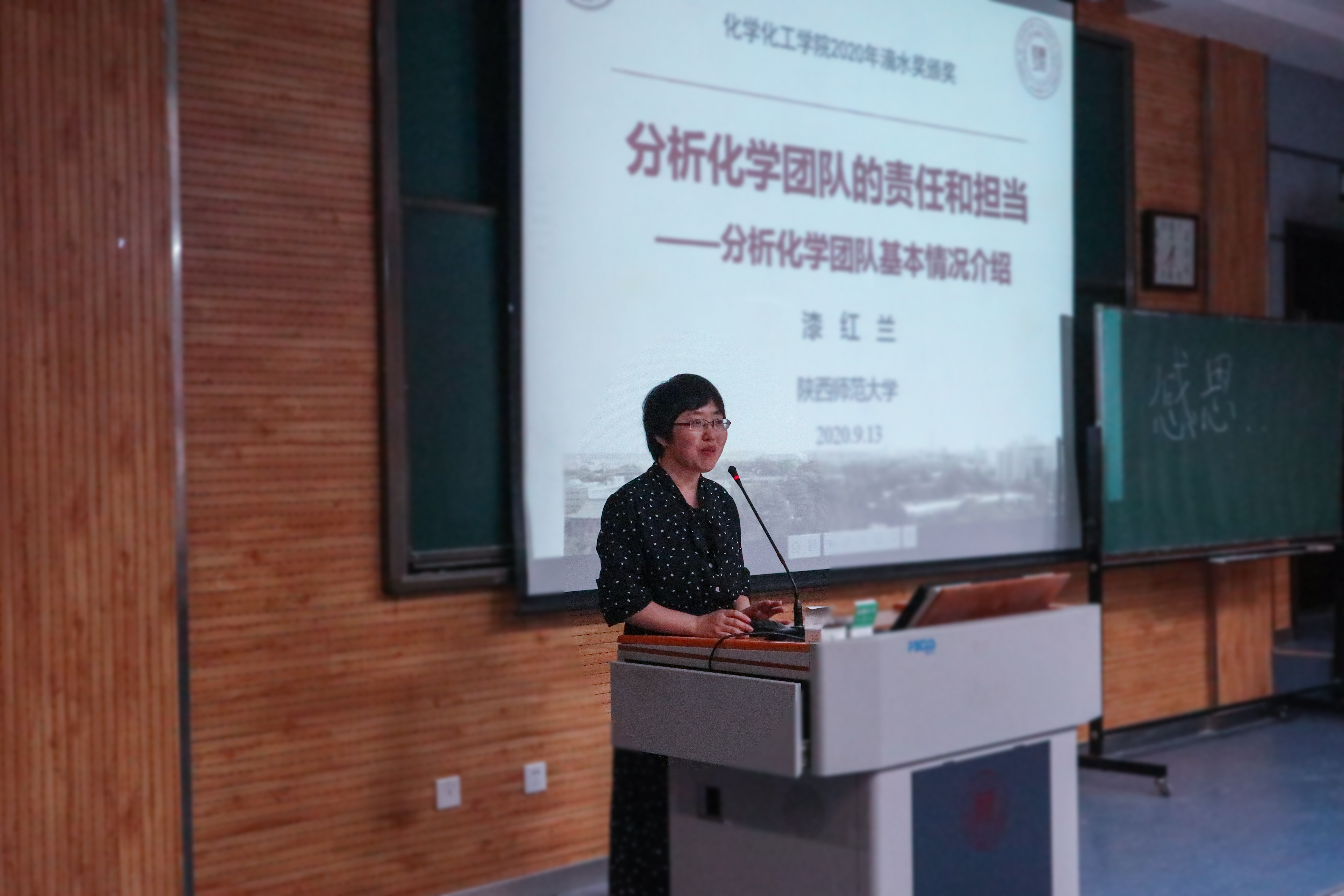 漆红兰老师以“分析化学团队的责任与担当”为题,从分析化学的学科背景、教学团队、科研团队及重点实验室四个方面,全面地介绍了分析化学团队的历史沿革和学科发展走向,并表示将坚定不移地传承老一辈教育者孜孜不倦、追求真理的工匠精神,努力践行为党育人、为国育才的初心使命。获奖学生代表白丽娟发表感言,她表达了对学院老师们的感谢,并呼吁同学们以求真务实、严谨科学的态度锤炼本领,将爱国之志化为报国之行,做追求卓越的新时代青年。