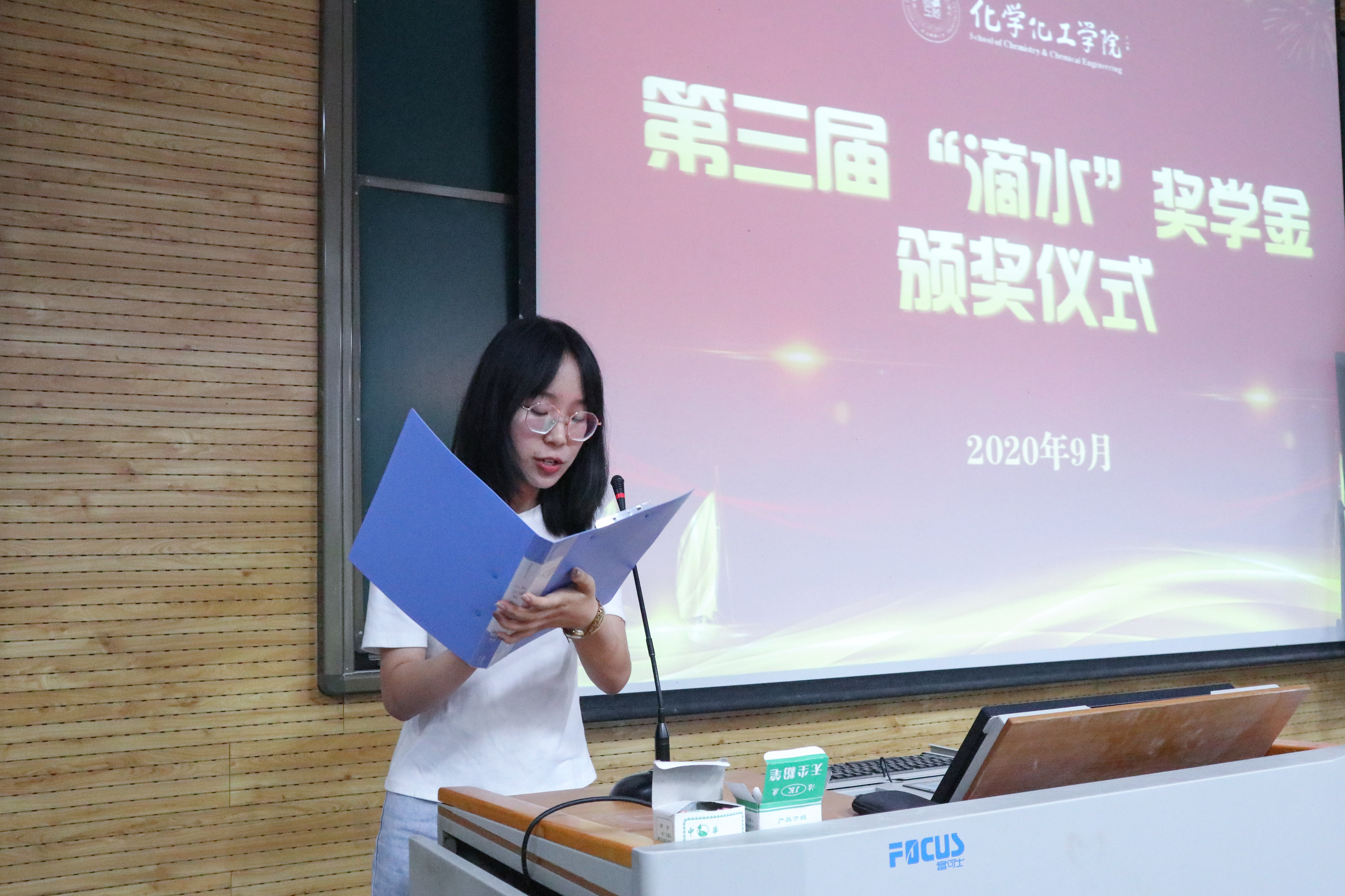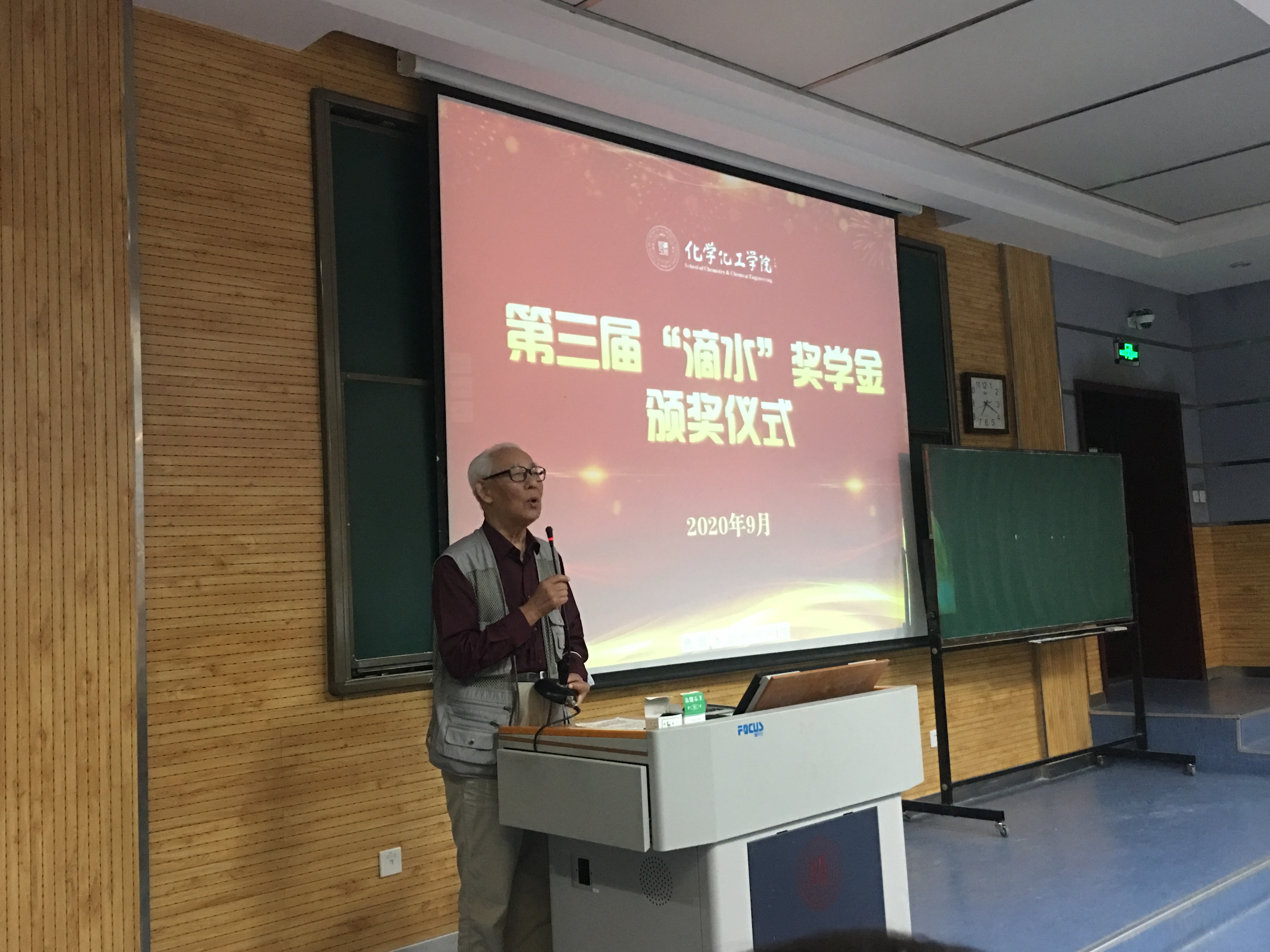 第三届 “滴水” 奖学金颁发仪式在雁塔校区5104教室举行。“滴水”奖学金是由学院退休教授薛封和老师捐资发起的,自2018年成立至今已有三个年头。薛封和老师、学院党委书记高玲香、分析化学教研室主任漆红兰、教工分析化学党支部书记刘伟、2019级辅导员邓文珺及2019级全体学生参加颁奖仪式。颁奖仪式由高玲香书记主持。