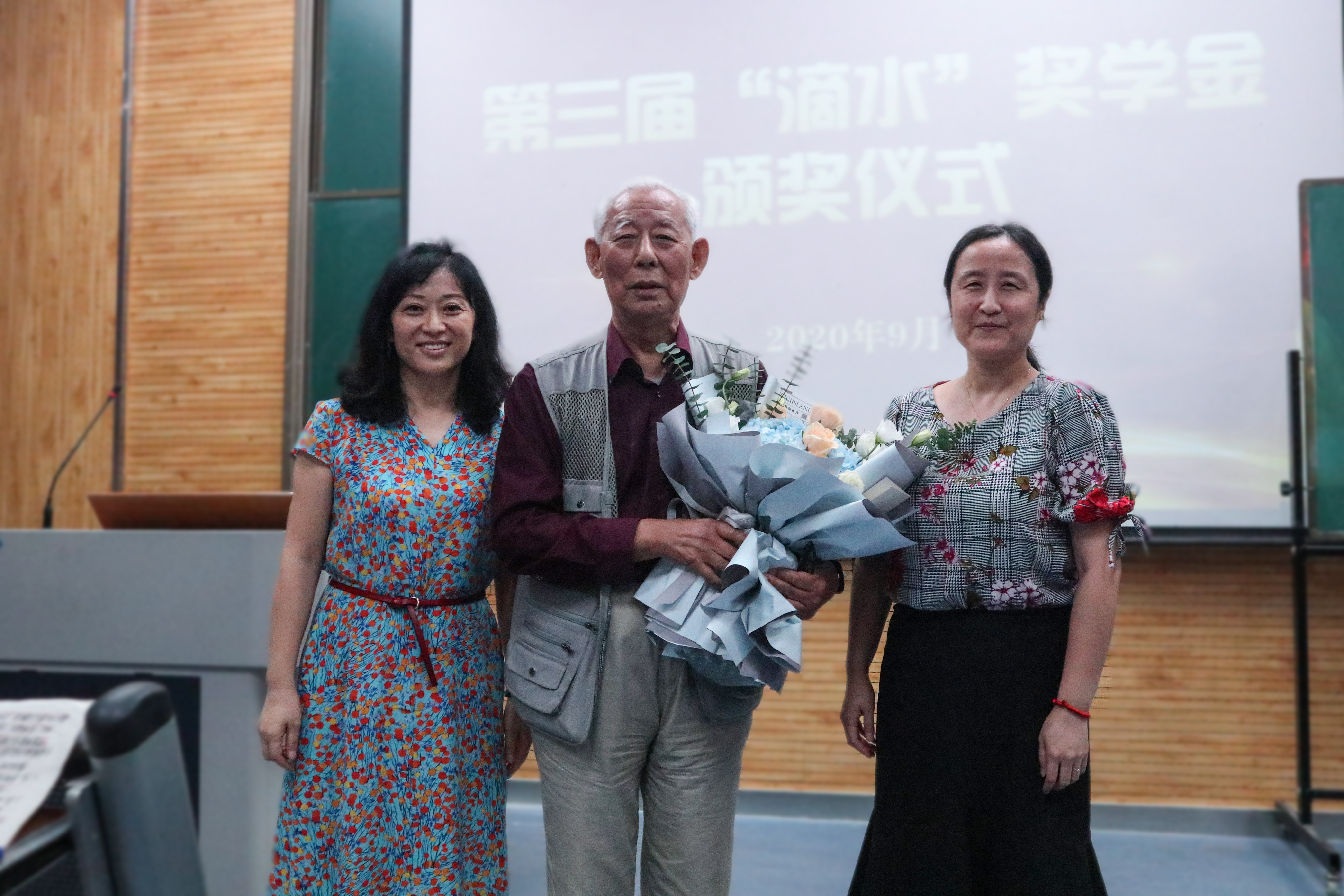 在热烈的氛围中,高玲香书记通过讲述学院发展历史与学科队伍建设历程,介绍了“滴水”奖学金的发起缘由与评选办法。薛封和老师为13名获奖学生颁发荣誉证书并讲话,他用亲切的话语分享个人亲身经历与多年教学心得,在黑板上郑重地写下了“感恩”二字,以此向同学们提出期许,一是要不忘历史、牢记党恩,尤其是在举国同心对抗疫情的战斗中感受中国制度优势,坚定爱国主义信念,勇敢肩负起时代发展和民族复兴的大任;二是要牢记身份、坚守传统,坚定文化自信,做中华优秀传统文化的忠实传承者和弘扬者;三是要不忘初心,锤炼本领,不断扎实学识与技能,让梦想在砥砺中前行。刘伟老师代表全体师生向薛封和老师献花,致以诚挚敬意和衷心感谢。