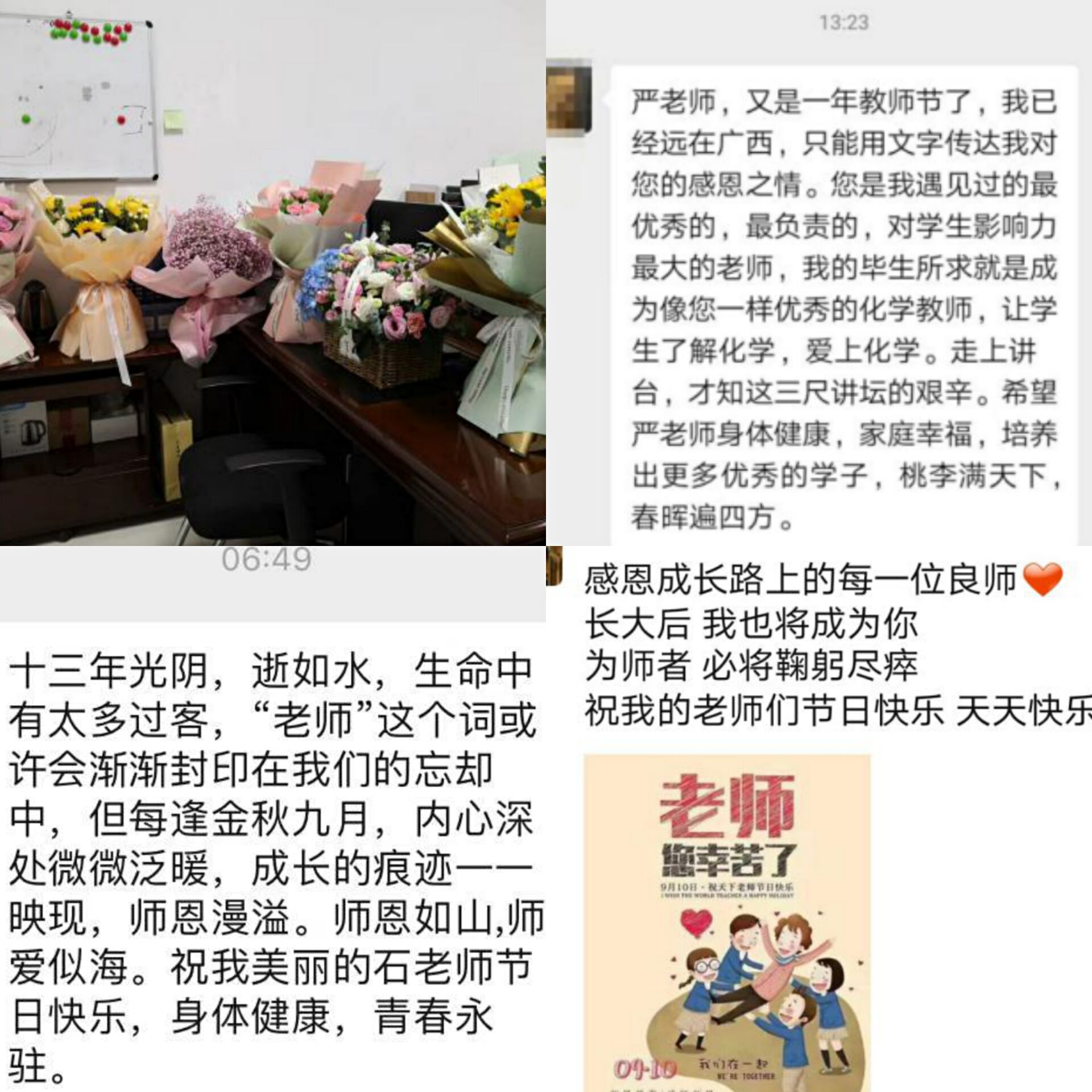 石先莹老师,一支粉笔,两袖清风,三尺讲台,您不仅传授我们知识,更教会了我们许多道理;您对我们的严格要求,使我们自律;孜孜不倦的叮咛,我们将永远铭记。恩师永记,师恩永记,祝老师开心幸福,节日快乐!