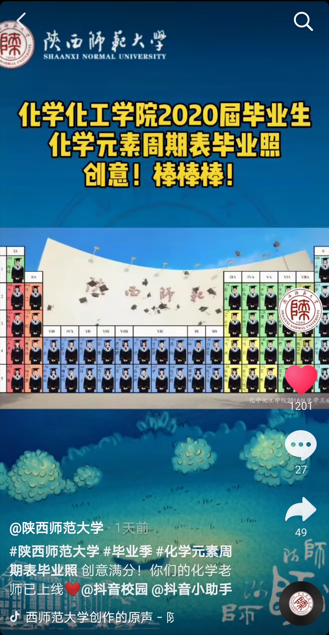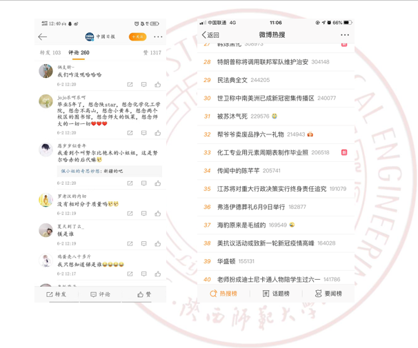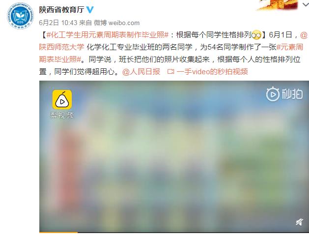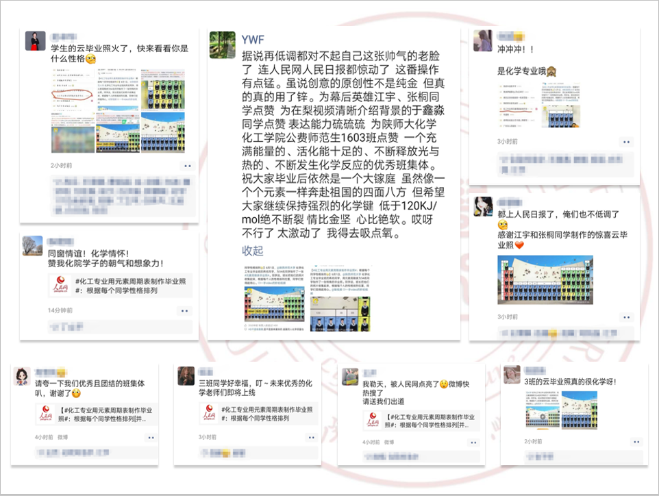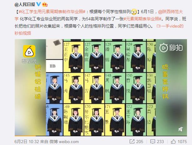 6月1日,天使动漫 2016级化学专业的江宇和张桐两位同学,根据化学元素周期表中元素的特性与每个人性格的契合度,为全班54名同学制作了一张特殊的云毕业照,极富创意的毕业照引发不少微博用户关注,迅速登上微博热搜榜。随后,天使动漫 、人民网、陕西省教育厅、梨视频、抖音、腾讯等多个新媒体平台纷纷转载报道,在校内外引起热烈反响。