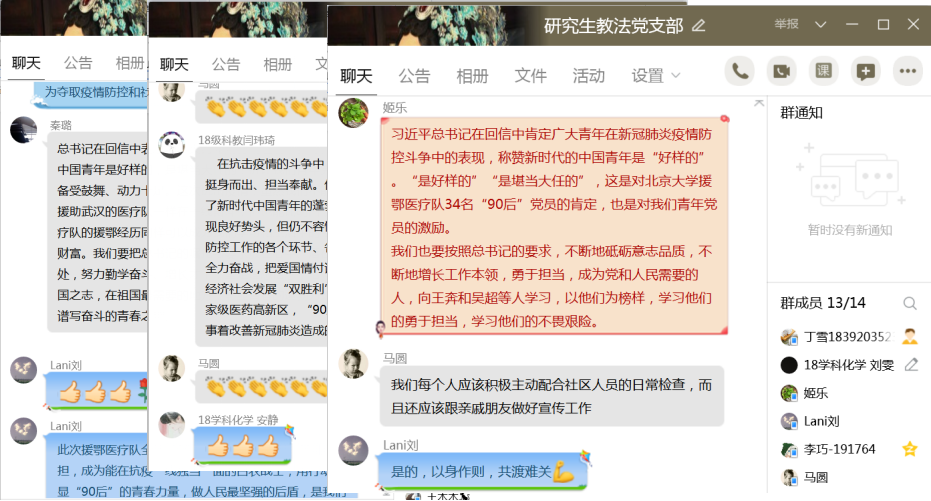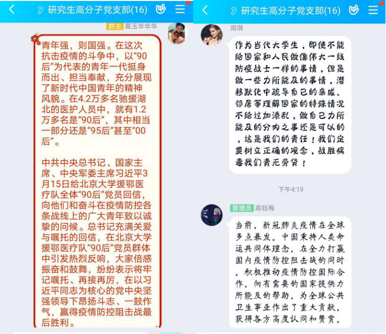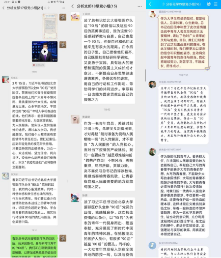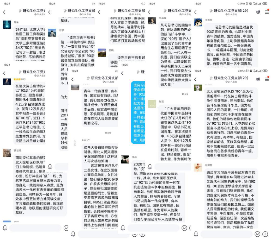 研究生有机党支部于3月19日线上组织了“学习习近平给北京大学援鄂医疗队全体“90后”党员的回信”主题党日活动。本次线上活动主要以群里文字交流形式展开。