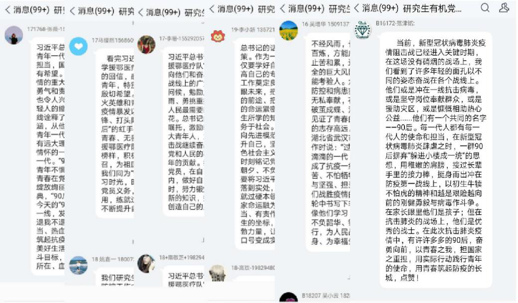 赖浩然同志表示90后见证了祖国飞速发展的三十年,终有一天会是中流砥柱,这次灾难会让90后更加坚韧,奋勇向前。“哪里有什么白衣天使,不过是一群孩子换了一身衣服,学着前辈的样子,治病救人,和死神抢人罢了。”这句话在抗击疫情斗争开始之时,深深触动了周琪同志的心,她指出作为当代研究生,即使不能给国家和人民做像伟大一线防疫战士一样的事情,但是一定要树立正确的观念,战胜病毒责无旁贷!