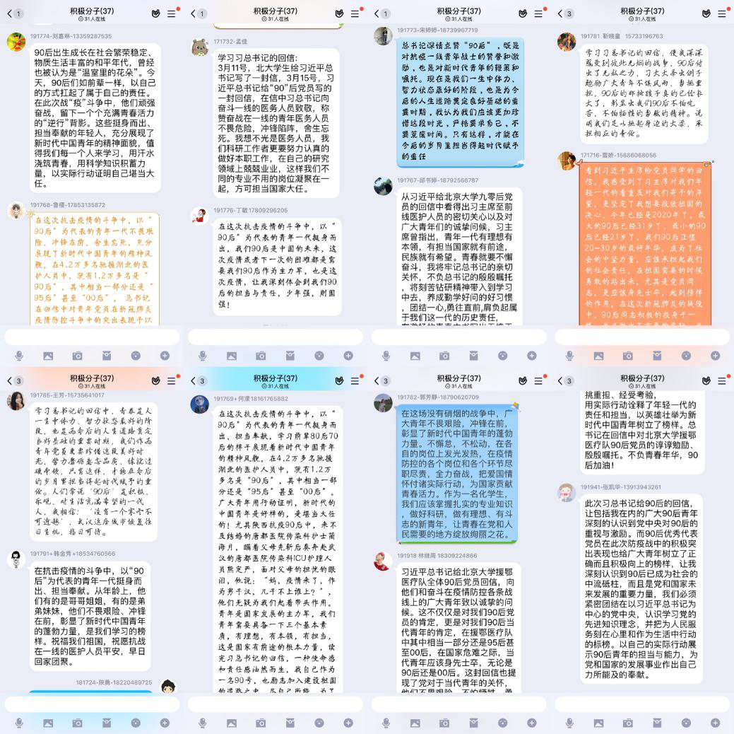会议第二阶段,支委会成员通过QQ群语音带领入党积极分子学习《习近平给北京大学援鄂医疗队全体“90后”党员回信》,向他们分享党员学习活动中收获的一些心得,并进行交流讨论。入党积极分子们也踊跃发言。由于会议时长的原因,部分未发言的同学通过文字的形式和大家分享了自己的感悟。