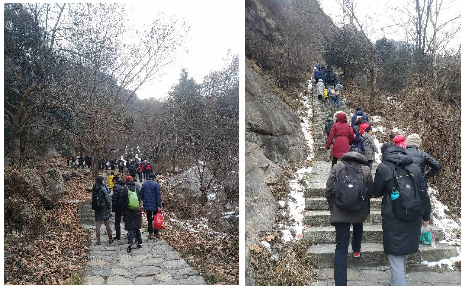 徒步行团队由来自各教研室、大型实验仪器平台及学院行政的老中青教职工及部分家属组成。学院工会提前做好行程安排、活动方案和安全预案相关事宜。早上8点30分,一行60余人在新校区家属区西门集合,乘车出发前往翠华山。冬日的翠华山宁静怡然、白雪朵朵、山泉潺潺,虽然天气寒冷,大家却被眼前的美景深深吸引。合影留念后,党委书记高玲香、工会主席张国防以及工会委员边红涛、黄治炎、张小玲、郭新爱六位老师作为小组安全负责人,组织大家徒步自由行,领略翠华山冬日雪景和冰瀑。在翠华山的迎客松下还组织了跳绳活动,大家玩得开心和快乐。
