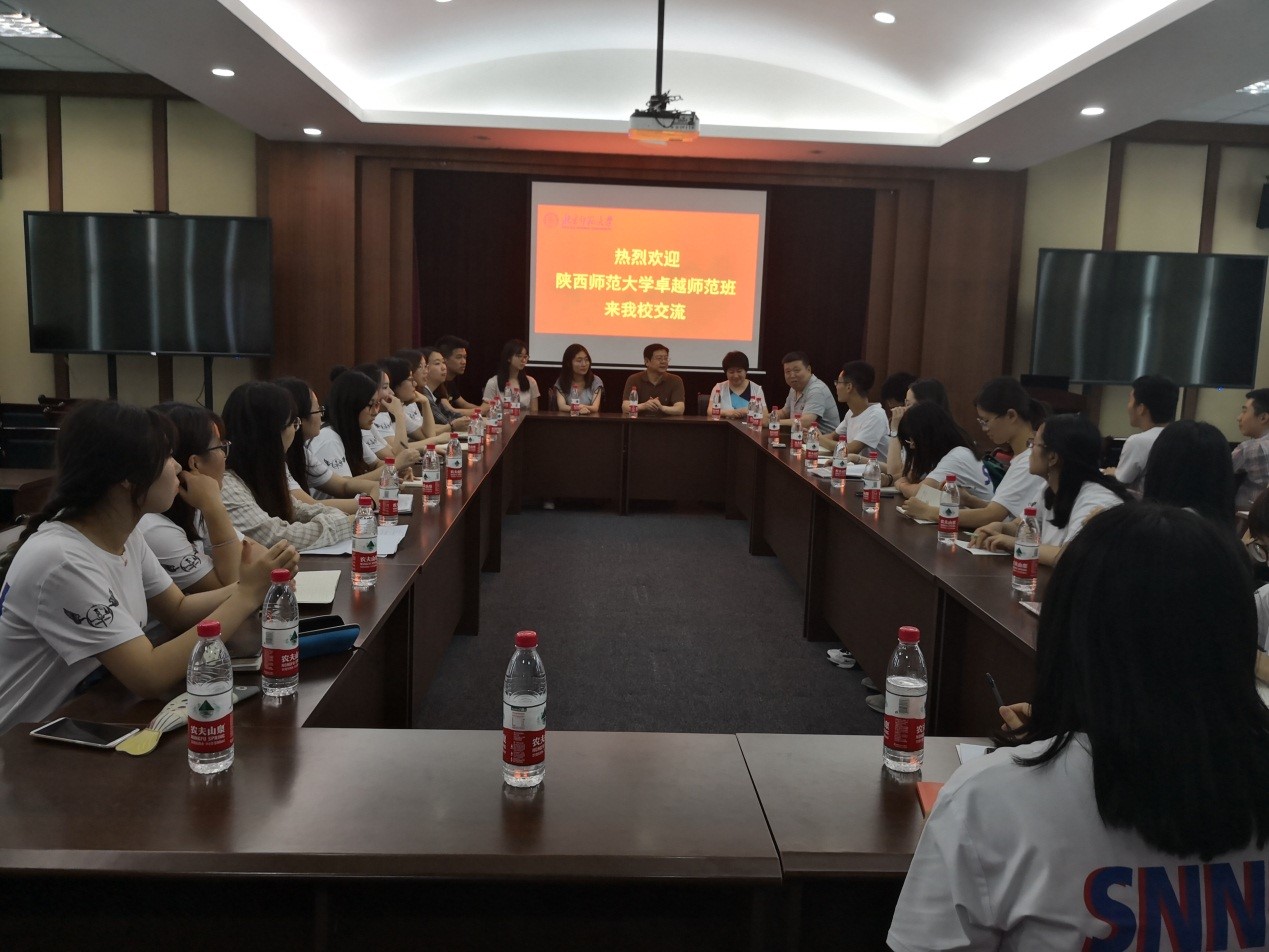 教授、博士生导师刘正平教授以及部分公费师范生代表进行交流座谈。期间,两校交流了彼此的师范生特色培养方案、教师教学技能训练课程设置和实习方案等,相互切磋学习。通过交流,同学们树立了终身学习的观念,意识到了研究型教师的必然性和重要性。