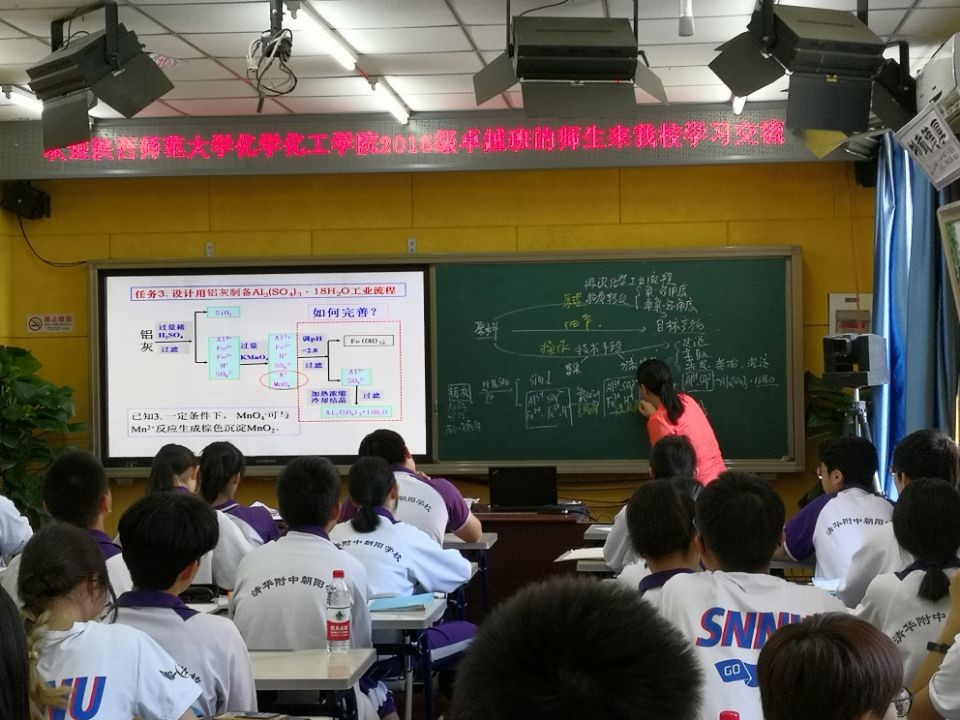 交流会后,大家聆听了杨鹏老师《海水资源综合利用》的示范课,杨老师讲授生动流畅,课堂气氛活跃,本节课以学生设计海水提取溴的工业流程为主线,学生运用教师提供的信息设计自己的工业流程图并展示,而后教师通过演示实验、讲解补充信息、动画等方式引导学生完善自己的工业流程图。课堂知识讲解的十分透彻,让学生知道每个流程的操作步骤、为什么要这样做以及各种方法步骤的发展,在课堂教学过程中也有学生提出不同的问题,杨老师都很自如地控制住了课堂气氛,课后,就如何实现课堂良好管理这一问题,杨老师和同学们进行了深入的探讨。她说了三点:一是老师要有自己的原则,要让学生知道你是有底线的;二是要尊重学生,每一位学生都没有恶意;三是与学生交流,充分了解学生。整个过程下来,同学们收获颇多。