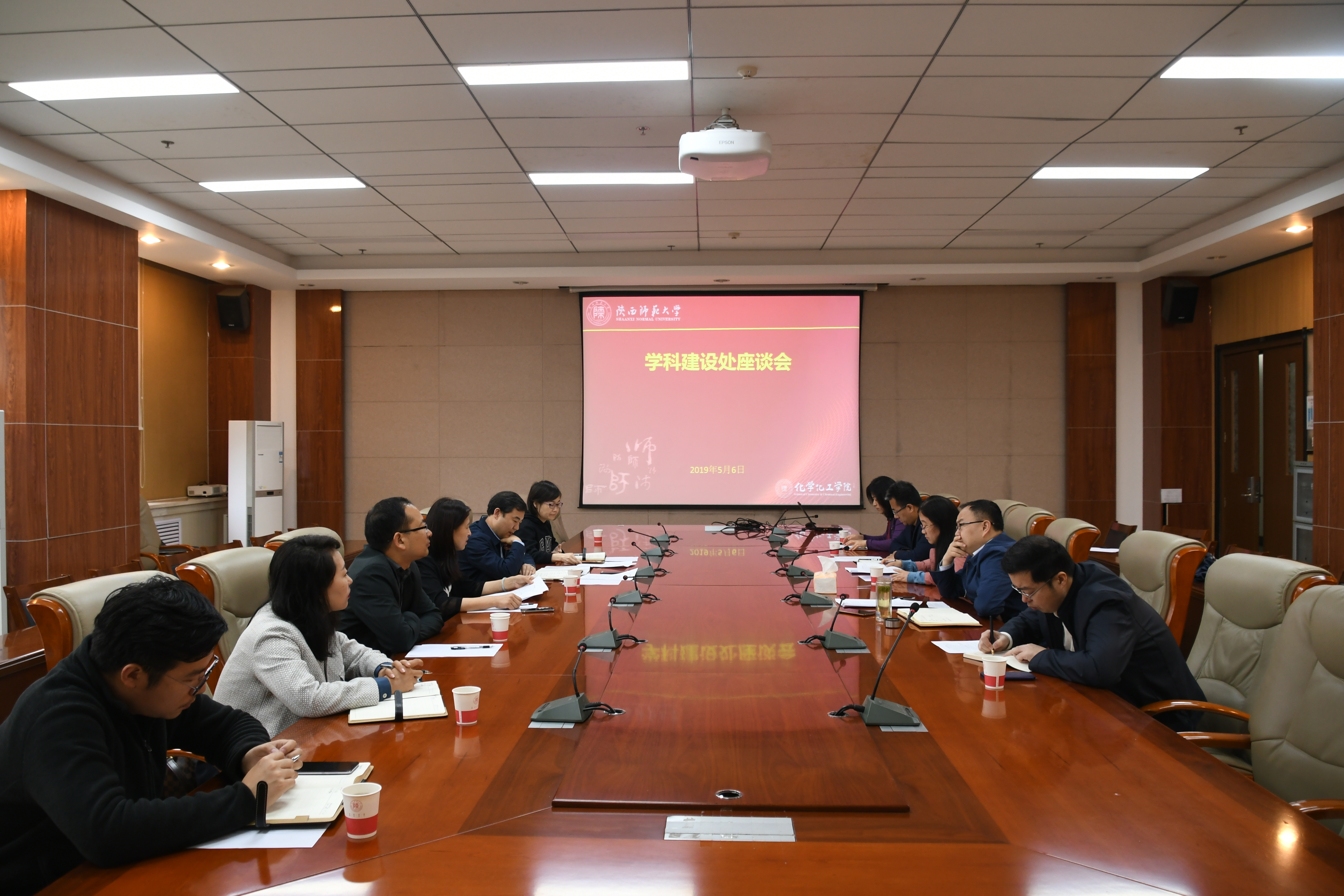薛东首先对姚若侠处长一行的到来表示热烈欢迎。随后,围绕第五轮学科评估,双方分别就学科评估指标与评价机制、人才培养、中外联合办学、校友工作和学术竞赛等方面进行了交流。薛东指出,以学科评估为契机,学院将巩固和发展化学和应化学科,同时要加强化学教育学科建设,突出学科教学传统优势。他希望,学科建设处能够牵头,加强各职能部门间联动,在奖励激励机制、经费支持等方面推动改革,使学院获得更多支持。