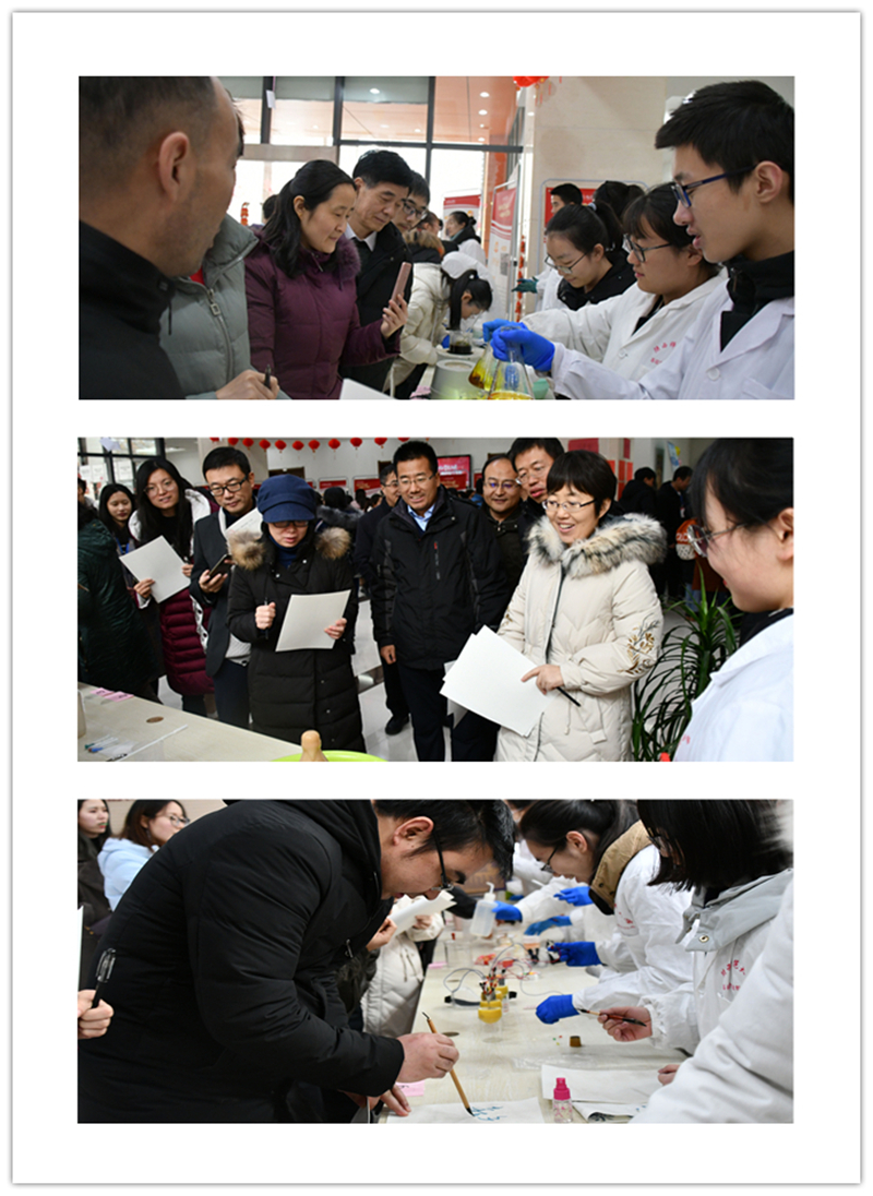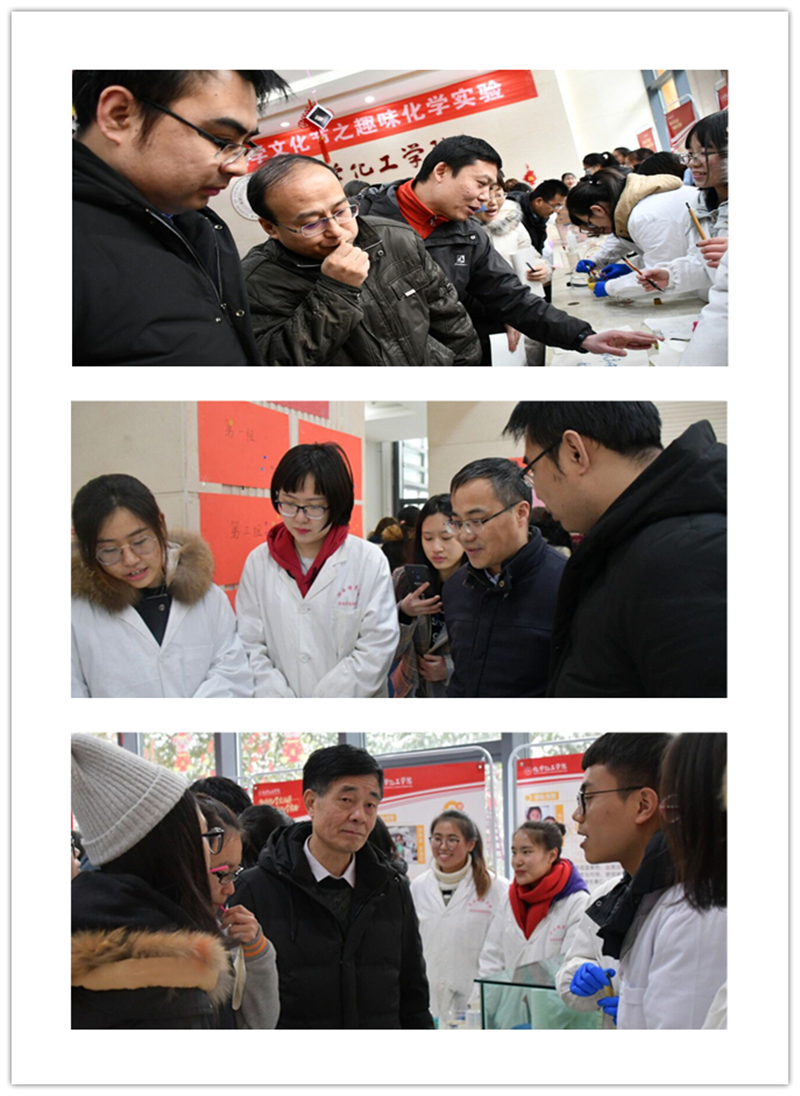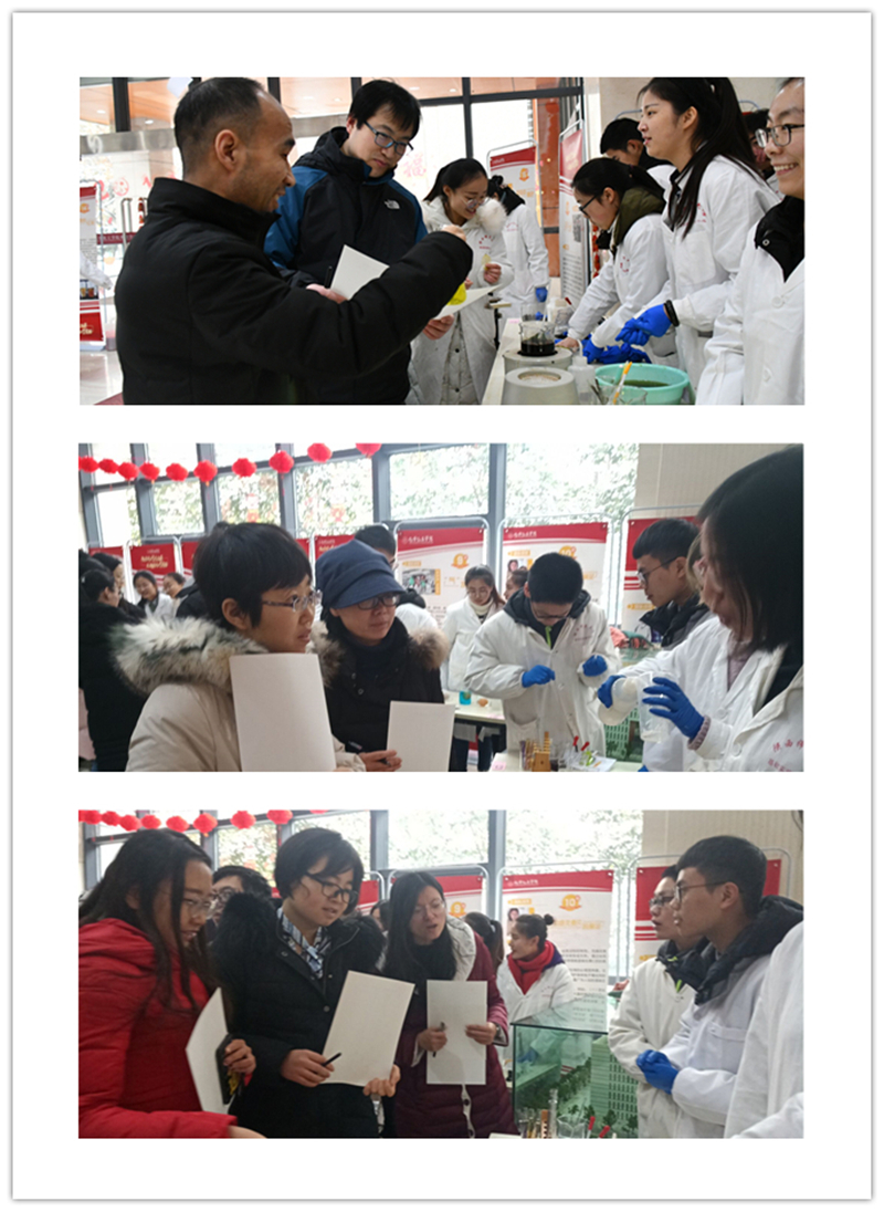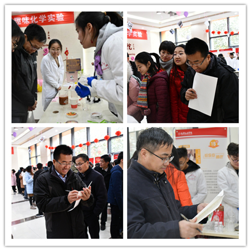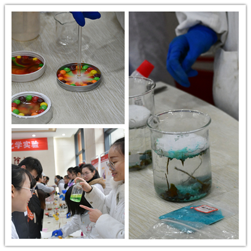 活动开始后,24个团队按照顺序开始实验展示。展示过程中,各团队成员默契配合,规范的操作、精彩的实验现象、生动的解说吸引了众多老师和同学驻足,一层大厅熙熙攘攘,人声鼎沸,气氛欢愉。在场的评委老师和同学们一起动手,用可乐制造了喷泉、用棉线钓起了冰块、摸到了软乎乎的蛋壳、在烧杯中见到了黄金雨、用彩虹糖看到了彩虹........大家热情高涨,对每组实验的展示都表示了肯定和好评,并提出了宝贵的建议和意见。