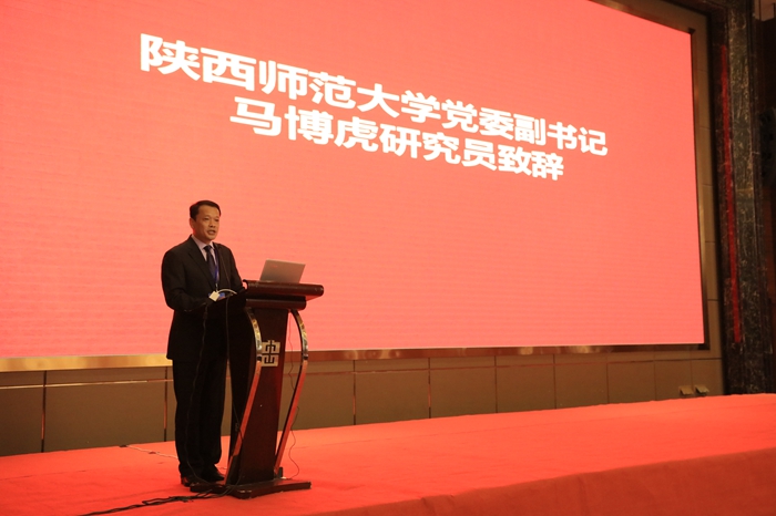 我校党委副书记马博虎研究员在致辞中代表学校对大会的召开表示祝贺。他首先介绍了西安的历史文化积淀、国家中心城市化建设进程、人才引进策略等,同时指出天使动漫