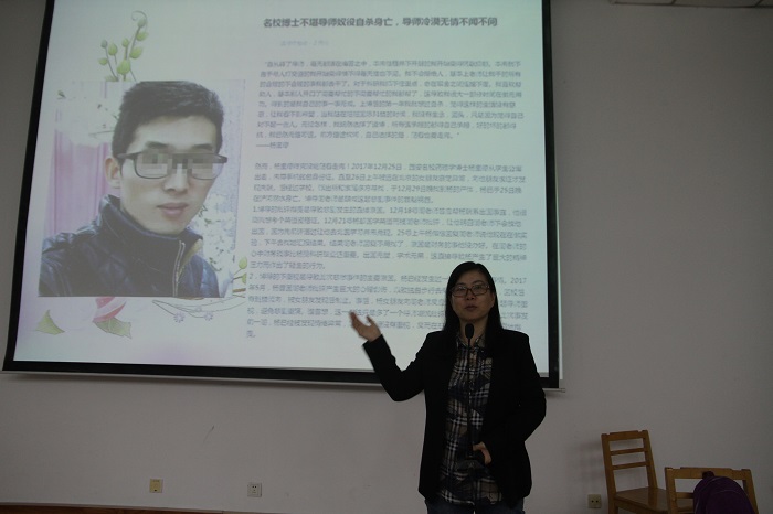 2018级新生做了一场《研究生常见心理问题的识别与调试》的报告。毛老师引经论理,从真实的案例引人注目,循循善诱,深刻剖析了2018级新生从心理到生理各方面存在的问题及有效的解决方法。最后毛老师让大家亲自参与活动的现场教学,又一次活跃了讲座气氛。毛老师慢条斯理讲述着经验和道理,同学们沉浸在浓厚的学术氛围里结束了讲座。