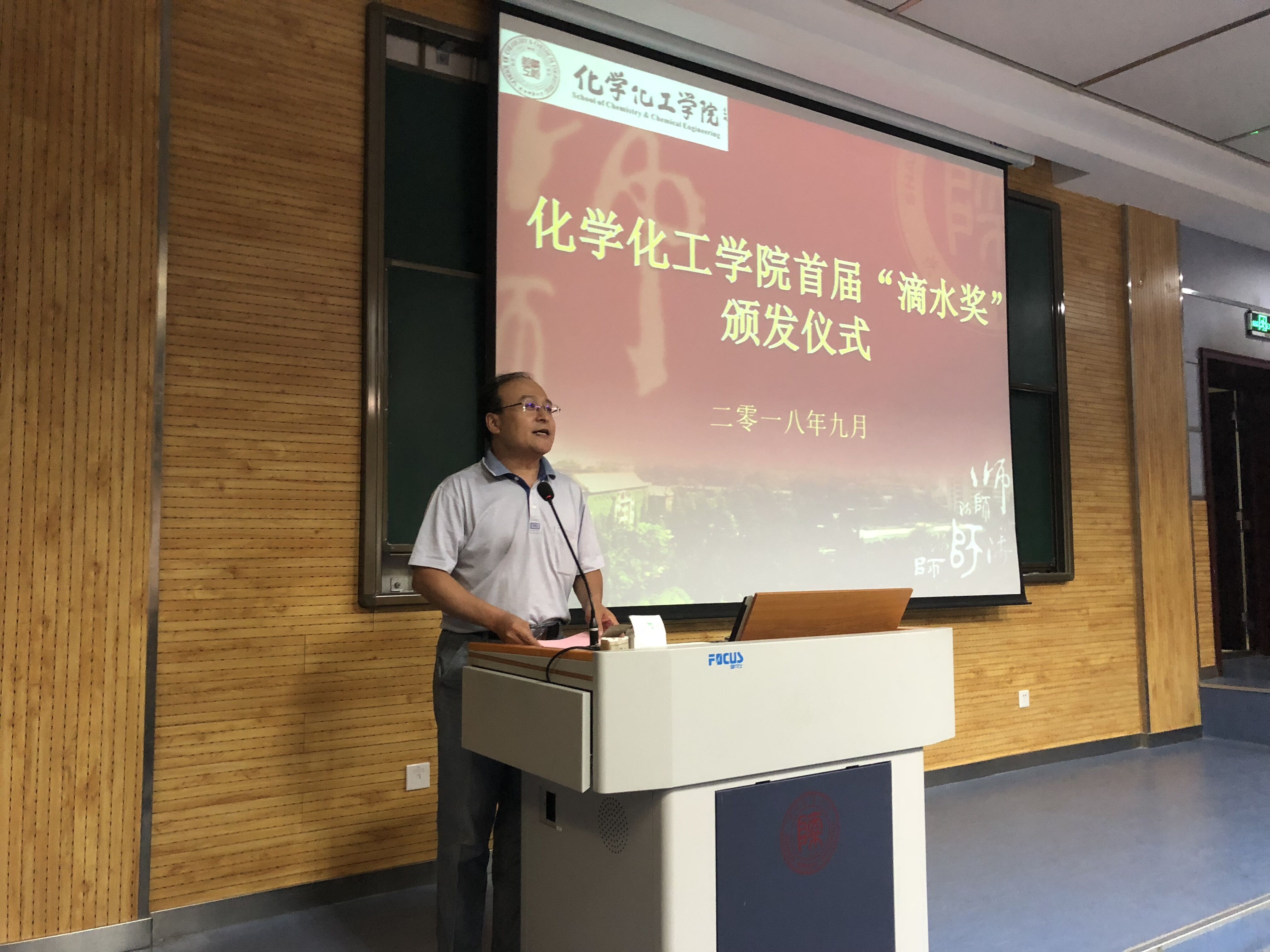 首届“滴水”奖学金颁发仪式在雁塔校区教学五楼5104教室举行。“滴水”奖学金捐资发起人、学院退休教师薛封和老师,学院党委书记高玲香、副书记王晓、分析化学教研室主任漆红兰、教工分析化学党支部书记刘伟、2017级学生辅导员龙卓华及年级全体学生参加了颁奖仪式。颁奖仪式由学院副书记王晓主持。