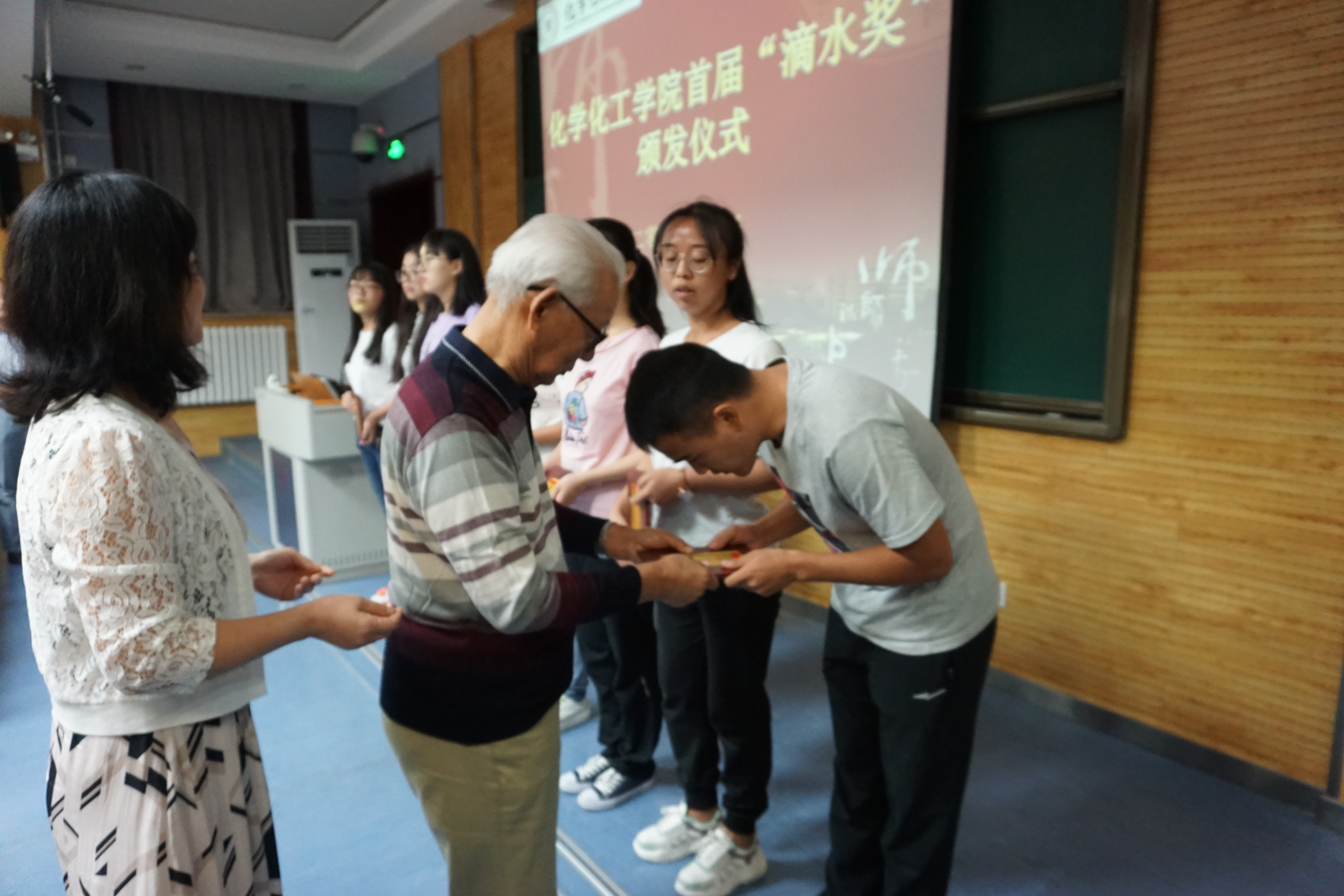 首届“滴水”奖学金获奖学生名单》。薛封和老师为七名获奖学生颁发获奖证书,与同学们分享了他对学院的感恩、对同事的感谢、对分析化学特别是化学分析实验的热爱,通过讲述自己年轻时学习和工作的难忘经历,告诫同学们要始终以一丝不苟、精益求精的工匠精神对待化学实验。他希望获奖的同学能够戒骄戒躁,继续努力,也希望没有获奖的同学取长补短,学习获奖同学的优秀品质。