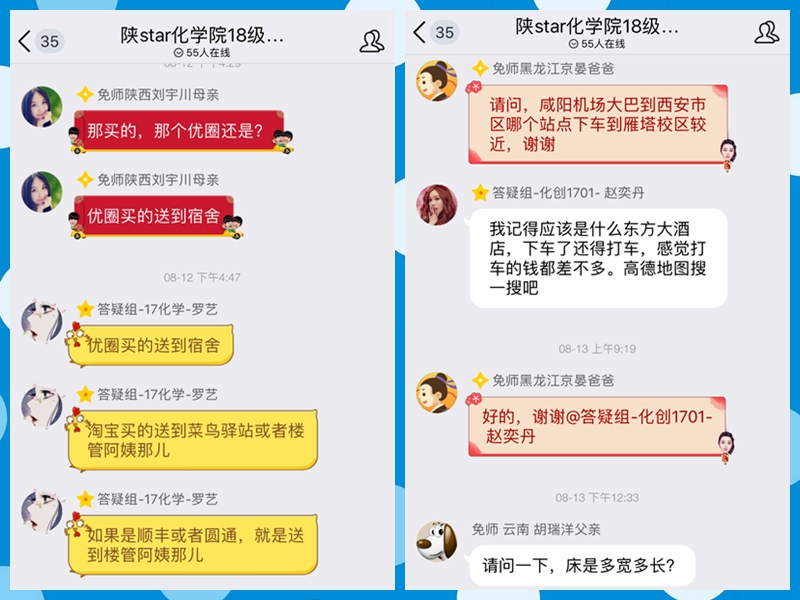 18级辅导员在招生录取结束后就提前组建了2018级新生及家长的QQ群、微信群。辅导员和迎新志愿者积极在线上为学生及家长答疑解惑并通过日常交流向新生传递大学的学习生活方式及价值观念,进一步了解和掌握学生的思想动态。为了增强思想政治教育工作的感染力和传播力,学院积极发挥网络新媒体的影响力,利用学院团委微信平台陆续推送迎新系列主题微信,为新生适应大学学习生活提供了全方位导引,为入校后的学习生活状态调整与人际交往打下了良好基础。