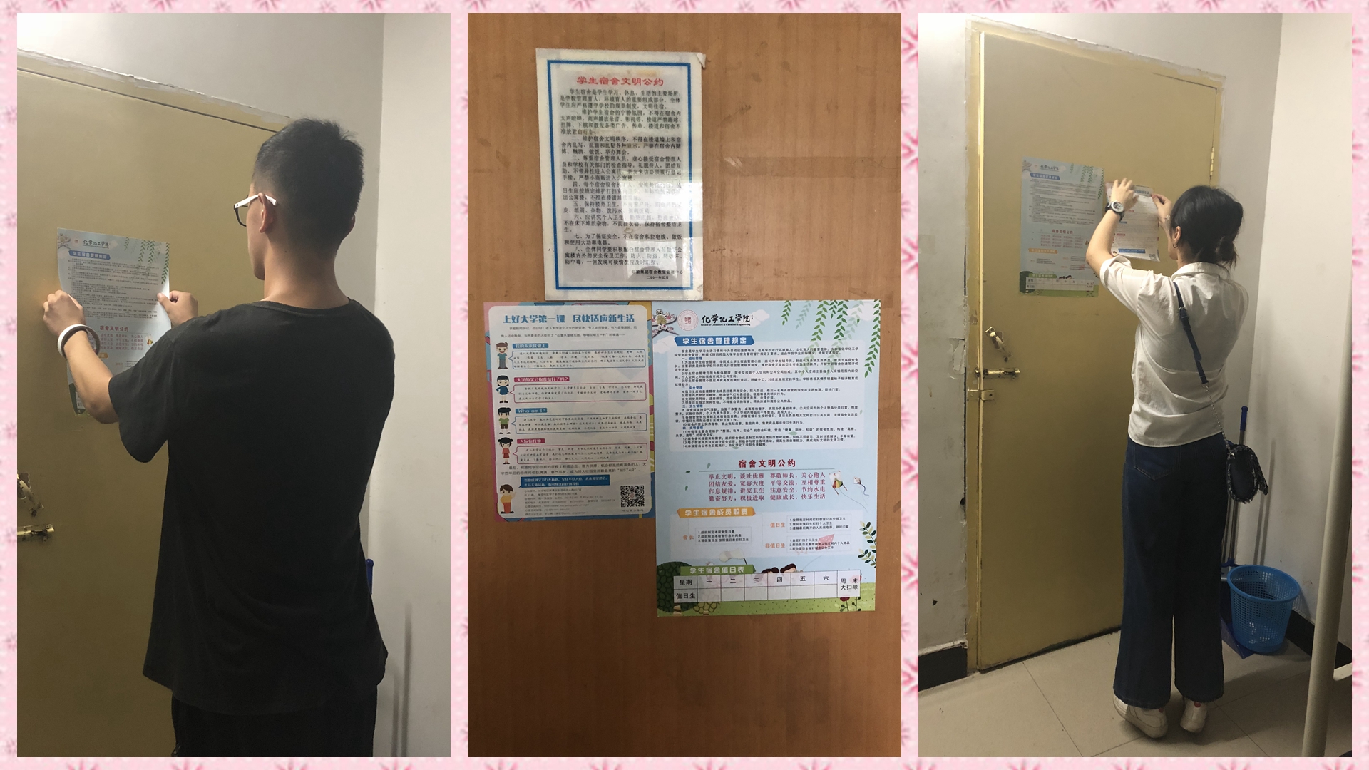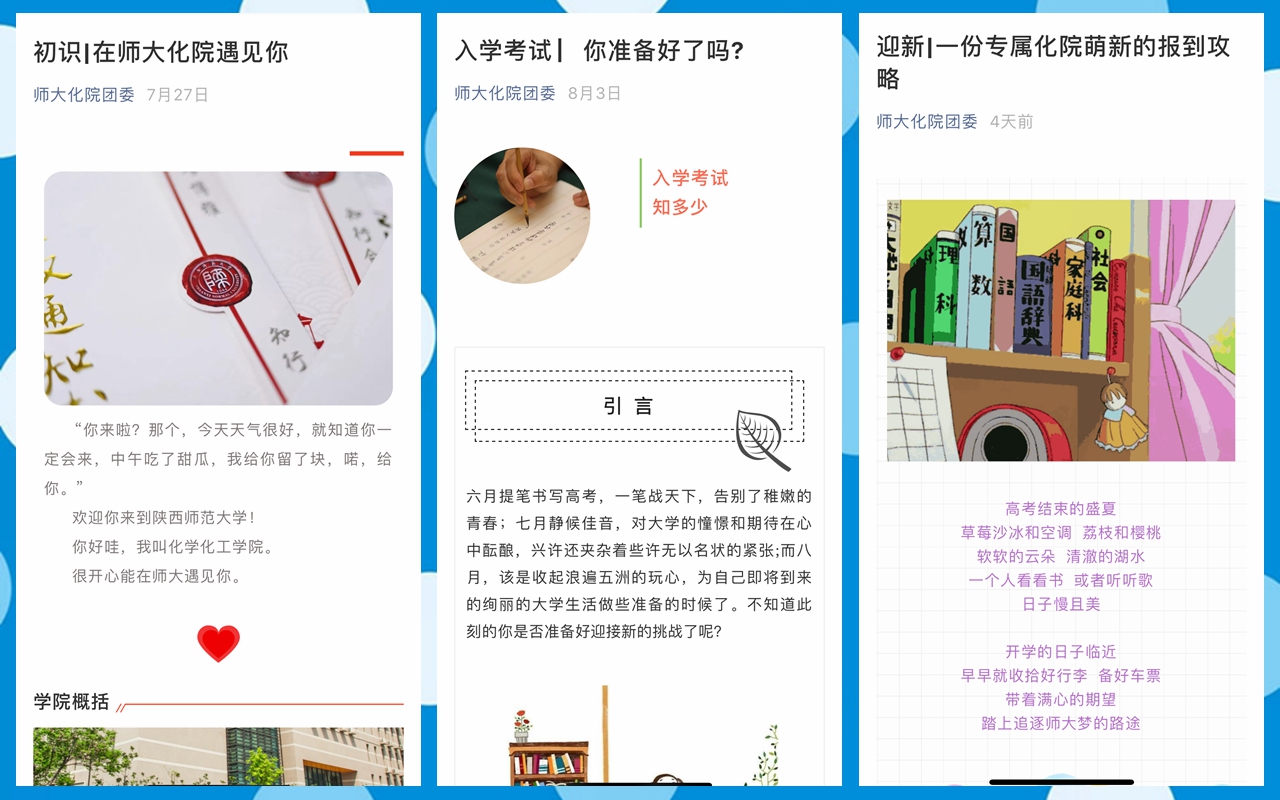 宿舍管理规定》和《文明公约》;262名新同学的到来,志愿者们用心用情进行服务。六附楼重新装点的办公室、主干道精心布置的宣传板、独具匠心的院服设计、细心编印的新生手册,这一点一滴都温暖着他们的心。