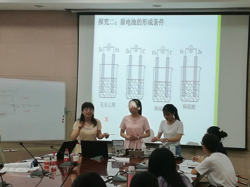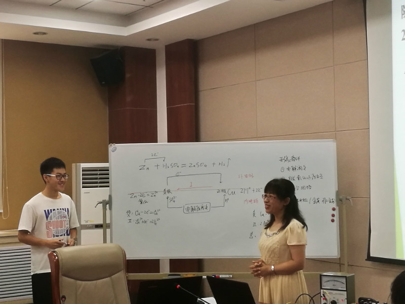 16日上午,培训会由严文法副教授主持。高新一中的惠青香老师进行了《原电池》的示范课。惠老师通过引入视频创设艺术情境,激发学生的学习兴趣,通过不断地设疑,引发学生的思维活动。与同学们的互动环节,惠老师通过她十几年的化学教师成长经历,鼓励同学们热爱自己的职业,爱学生,多参加各种教学活动锻炼自己,重视研究化学实验。接着,四位同学进行了试讲,惠青香老师、严文法老师分别就同学们的课堂质量和教学设计等方面进行了点评。