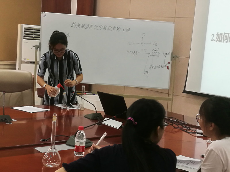 16日下午,培训会由陈亚芍教授主持。陕师大附中的张小茹老师进行了《物质的量在化学实验中的应用》的示范课。张老师采用问题解决式的教学策略,学生分组合作的学习模式,使学生们在实验的过程中来解决问题、形成概念,将学生被动的接受知识变成在实验的过程中自主地参与概念的形成,以掌握知识。随后,五位同学进行了试讲,张小茹老师、杨承印老师、薛亮老师们分别从授课内容、教学方法、教学设计等不同角度对同学们进行了有效指导。