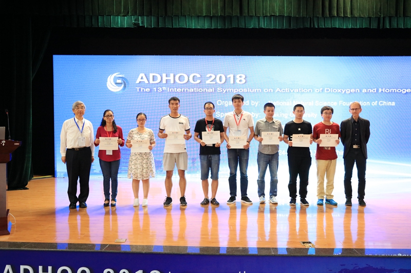 老师和学生为ADHOC2018前期筹备和顺利召开所付出的辛勤工作。大会秘书黄治炎宣读了10位获得优秀墙报奖的参会同学名单,并邀请Matthias Beller教授和Jun-ichi Yoshida教授为同学们颁奖。最后,ADHOC2018在参会专家的掌声、会务组及志愿者合影中慢慢落下帷幕。