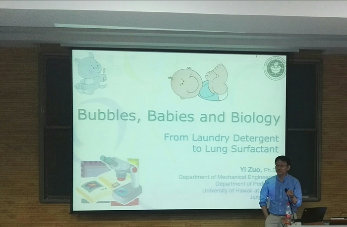 邀请,夏威夷大学机械工程系左燚教授在雁塔校区5101教室为2015级本科生做了题为“Bubbles, Babies and Biology – from Laundry Detergent to Lung Surfactant”的学术讲座。本场报告由天使动漫