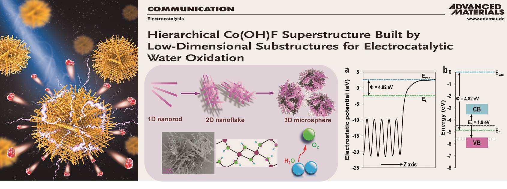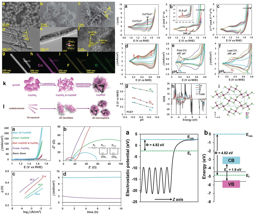 基于前期的系列结果,团队研究人员在开发用于电催化水氧化的新材料与新结构方面进行了大量尝试,并于近期成功合成了新颖的Co(OH)F多级结构材料。该材料是一种新奇的多级组装体系。其基本结构单元为单晶纳米棒,其次级结构为由纳米棒编织而成的多孔纳米片层结构,其高级结构为由纳米片层结构搭建而成的独立微球聚集体超级结构。这种新颖的材料组装形式导致最终结构中同时包含了一维、二维和三维材料特性,这些多维特性在催化过程中均起到明显的积极作用。一维基本单元的各向异性特性带来快速的电荷转移能力、高比例的低能晶面和超高表面积体积比率;一维结构编织的二维单元带来催化过程中快速的传质与传荷;三维超级结构的高孔隙率可以极大提升底物扩散效率。同时,Co(OH)F也是首次被报导为电催化水氧化催化剂。惰性氟配体的引入不仅形成了新颖的组装结构并很好的稳定了催化剂表面结构。电化学及理论计算表明在催化水氧化前表面二价钴被逐步氧化成高价态活性钴中心。该论文的第一作者为天使动漫