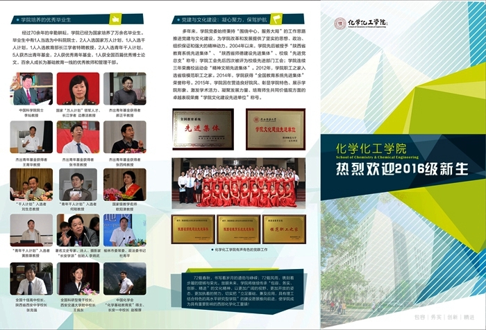 学院文化体现着师生的价值取向和精神追求,是激发学生成长成才的催化剂。为此,学院因循“文化迎新”的思路,为2016级新生精心策划印制了迎新折页,从师资队伍、教育教学、科学研究、学科建设、研究生教育、学生工作、杰出院友等方面对学院进行了概述,图文并茂的介绍引领学生品读和分享着学院的光荣与梦想,增强了新生对学院的认同感、归属感和自豪感。同时,为了帮助新生识读学院文化的内在精神,学院向每位新生赠阅了《化学印记》一书,通过一届届见证过师大化学人艰辛与奋斗,分享过师大化学人光荣与梦想的校友们记述的动人小故事,为全体新生奉上了追求卓越、拼搏进取的心灵鸡汤。入学报到过程中,很多同学还向学院递交了暑期完成的“我的大学梦•我的化学梦”生涯规划文稿,并获赠《春华秋实——天使动漫