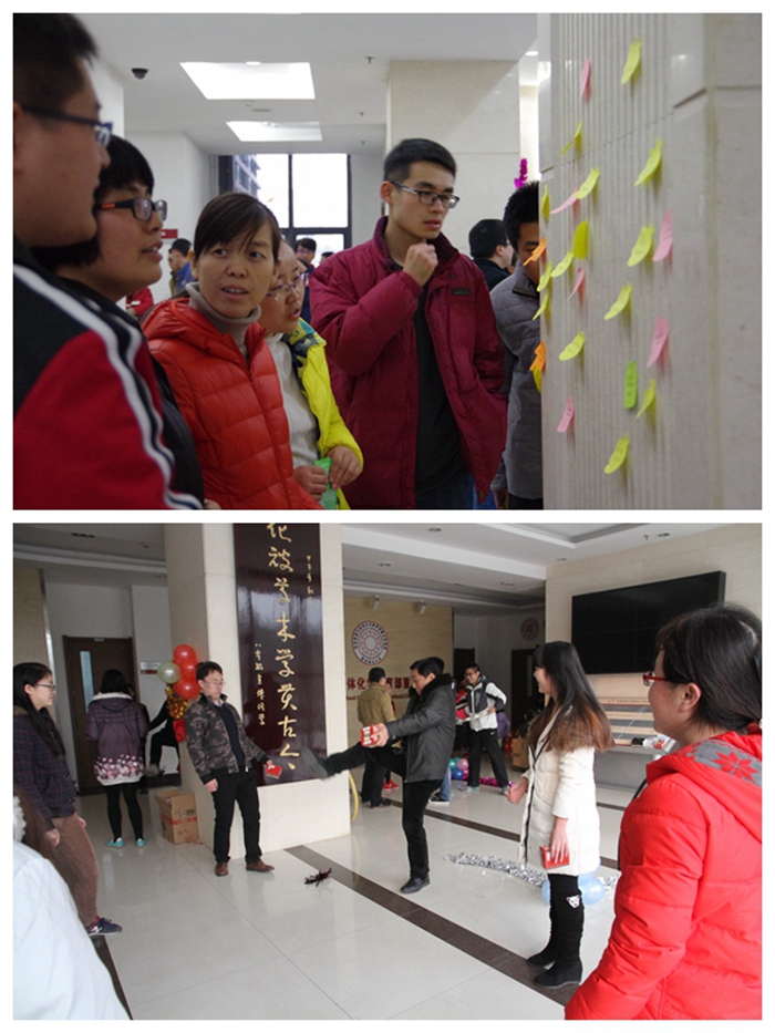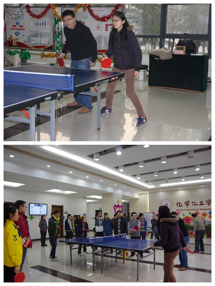 为喜迎2016年元旦的到来,丰富师生的业余生活,增进师生感情,激发全体师生团结拼搏、积极向上的协作意识和团队精神,2015年12月30日至31日,院工会联合院团委在学院一层大厅举办了主题为“化院师生情,爱乒才会赢”的师生乒乓球友谊赛。