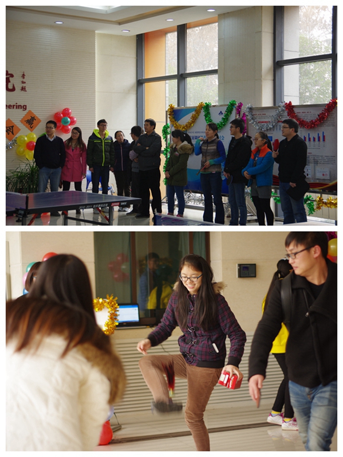 比赛开幕式上,学院党委书记高玲香教授在致辞中向大家介绍了举办此次活动的初衷,并对到场参与活动的老师和同学们表示热烈的欢迎。她指出,此次联谊会一是要表达同学们对老师们一年来辛苦工作的感激,二是希望借此活动传达学院领导和老师们对同学们的亲切关怀。此次联谊会以乒乓球比赛为主体,另附加了趣味娱乐项目,让师生们放松了身心,增进了交流。在乒乓球比赛中,老师与同学默契配合,学生出现失误时老师轻拍其肩膀给予鼓励,获得分数时,学生老师相互拥抱欢呼,现场气氛紧张又不失欢乐,到处洋溢着老师和同学们的欢声笑语。一旁观战的同学们不停地用手机拍照,都希望留下这一个个美好的瞬间。与此同时,游戏环节也有声有色地同步进行。“毽舞飞扬”游戏中,师生共踢毽子,笑声不断;“一圈到底”游戏中,师生手拉手围成圈协同合作,在呼啦圈中穿梭;“飞镖掷准”、“猜灯谜”和“一飞冲天”游戏中也是参与者众多,现场热烈而融洽。