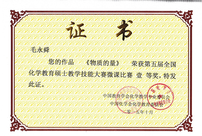 化学教育专业多位研究生获奖,高慧、毛永舜获得了第五届全国教育硕士教学技能大赛微课比赛一等奖,程思源、叶舒妍、刘欢、蒙文英、马育谷获二等奖,鲁春梅获三等奖。