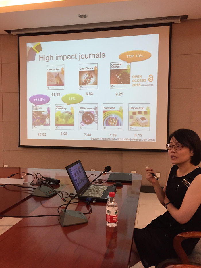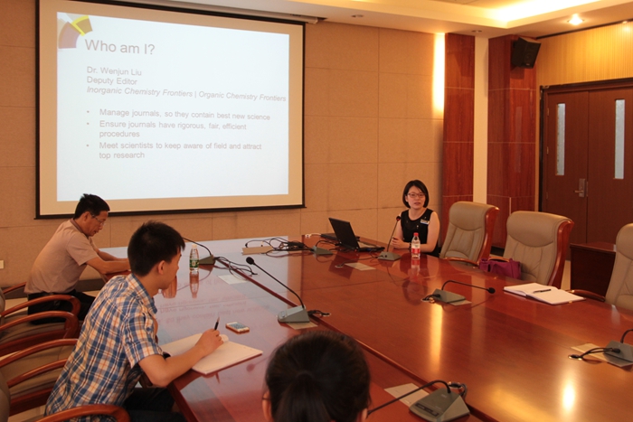 报告中,刘文君博士首先介绍了英国皇家化学会的基本情况,旗下主要期刊的杂志定位、影响力及出版服务等概况。随后,她着重介绍了RSC新创刊的两本杂志:Inorganic Chemistry Frontiers和Organic Chemistry Frontiers。这两本杂志分别由中国化学会、一所国内主要科研机构、RSC共同所有,主要发表化学二级学科的前沿研究工作。刘博士从文章选题、摘要撰写、如何投稿等方面与在场师生分享了她宝贵的经验,并期待我校师生能将优秀的研究工作发表在RSC旗下的期刊上。