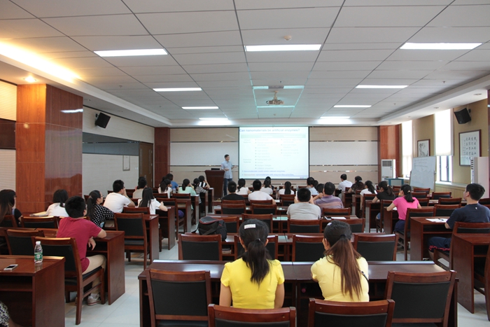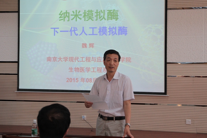 报告中,魏辉教授向在场师生系统介绍了模拟酶的发展及其团队近年来在模拟酶研究方面所取得的进展。他以CeO2、C60、Au等几种不同类型纳米酶为例详细介绍了其模拟天然酶的作用原理及其在生命活性物质测定中的应用。