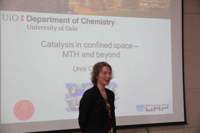 报告中,Unni Olsbye教授向在场师生介绍了其团队近年来在沸石材料的合成、表征及其作为甲醇制烃反应催化剂在机理研究方面所取得的进展。详细介绍了沸石类催化剂在烯烃及芳烃甲基化反应中的应用。