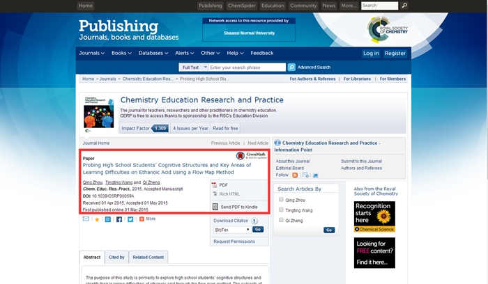 化学教育与科学教育研究团队周青教授课题组相关研究取得突破性进展,相关工作以《Probing High School Students’ Cognitive Structures and Key Areas of Learning Difficulties on Ethanoic Acid Using a Flow Map Method》为题在英国皇家化学学会(Royal Society of Chemistry)所属杂志《Chemistry Education Research and Practice》(Impact Factor:1.309)在线发表。
