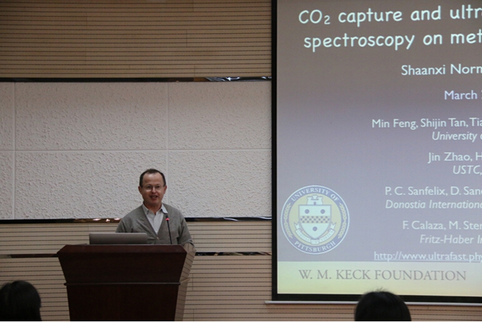 Hrvoje Petek现为美国匹兹堡大学物理学和天文学系教授,同时在欧洲和亚洲的多所大学担任客座教授。Petek教授的研究兴趣主要集中在固体表面飞秒化学,表面光催化及相干激发超快显微镜学等方面。他在相干超快光谱和固体材料显微镜学领域做出了突出贡献。Petek教授在简单介绍CO2检测、捕获、转化的重大社会意义和经济意义的基础上,着重介绍了其研究小组在金表面基于Au-PDI有序聚集体对CO2气体的捕获、还原、扫描隧道显微表征方面的研究进展,生动地展示了CO2气体分子在固体表面排布的可视化的纳米世界。之后,多位老师就相关学术问题同Petek教授进行了深入讨论。会后,Hrvoje Petek教授在房喻教授陪同下参观了光子鼻与分子材料研究团队的实验室。
