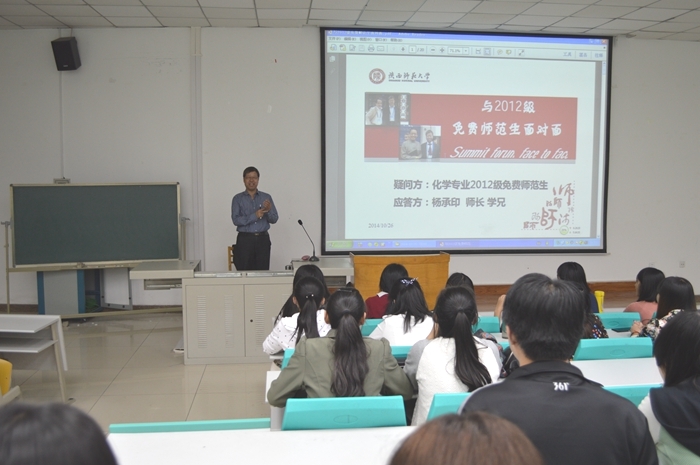 报告会上,杨承印教授以“提高专业素养,抓紧教师技能训练”为主题,帮助同学们进行了学业发展规划。杨老师不但对师范专业的发展前景做了详细解读,而且结合自身的教学实践经验和新课程改革下的教育需求,为大家分析了免费师范生的就业优势,并号召同学们刻苦学习专业知识,踏实练好教学基本功,全面提高从事教师教育工作的技能。杨老师特别引用笛卡尔的名言“我思故我在”,勉励免费师范生要努力做到专业素养和教学基本功二者兼顾,既做好人文科学的学习,同时也要做好实验,做好专业上的研究。在具体谈及从教技能训练的问题上,杨老师强调,教学有法,教无定法,贵在得法。只有明确课程讲授的教学标准、掌握适当的哲学和教育心理学知识以及做好教学设计,才能将课上好。在交流中,杨老师还向大家推荐了许多教育学方面的经典著作,鼓励同学们提高教育教学的理论素养。