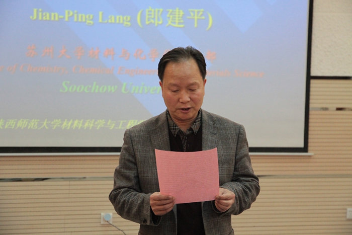 郎建平教授首先由自己留学日本时期的研究工作谈起,引出了在国内开展含簇配位聚合物工作的研究动机和目的。他详细地介绍了近年来国内外学者在簇基配位聚合物方面取得的研究进展。接着,郎教授详实地向在场师生介绍自己课题组在该领域所发表的代表性论文,并结合每篇论文的亮点把在座的学生带入了一个神奇生动的簇基配位聚合物世界。