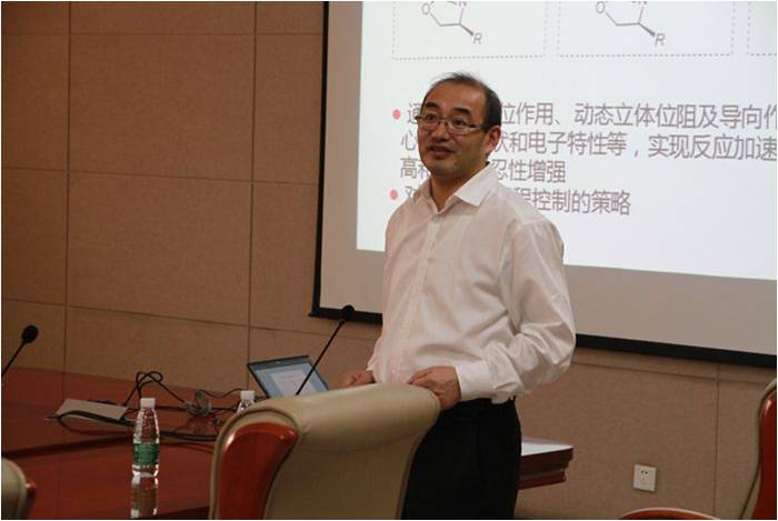 唐勇研究员首先向大家介绍了均相催化剂的设计合成、边臂策略的提出与在叶立德反应、不对称催化及聚烯烃催化剂等方面的应用。基于这些理论基础,他为在场师生展示了自己课题组近年来在该方面所取得的研究进展和成果。