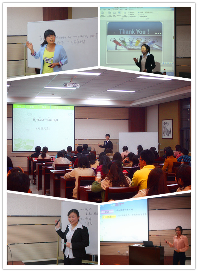 在主持人的介绍下,比赛正式拉开序幕。本次决赛分为两个环节,包括7分钟多媒体讲课和评委提问。在7分钟讲课中,选手们各显其能,尽显魅力。他们授课形式多样,教学方法灵活,教学内容丰富,教学气氛热烈,不但充分体现出大家对教师职业的热爱,而且向在场老师和同学们展现了自己扎实的专业知识和语言表达水平。比赛中,选手们着装得体,表情自然,内容充实,课件精美,精心设计的授课方式得到了大家的一致认可。经过评比,化学二班车倩同学凭借精彩的课程设计和自然大方的教态摘得了比赛的桂冠,化学一班张继芳和化学二班袁莉荣获二等奖,化学二班陈才、化学一班邹阳和化学创新二班付悦玮荣获三等奖,化学三班孙宝园、化学三班王欣和化学一班马云峰获得优秀奖。