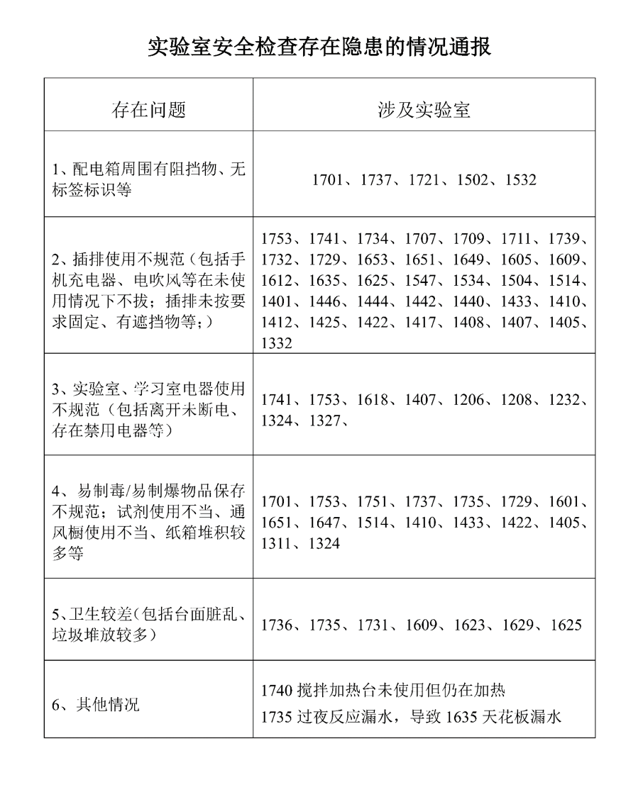 检查结果显示,学院整体安全情况良好,但仍存在以下问题:1、部分实验室存在违规电器,如电暖气等;2、大部分实验室存在电源插座连接不规范、人走未断电等情况;3、部分实验室存在私拉电线、插座超负荷运行等情况;4、部分实验室台面较乱、杂物存放较多。希望通过本次实验室安全检查工作,学院全体师生能够及时排除安全隐患,提高安全意识,营造安全可靠的实验环境,以崭新面貌开展新学期的学习和研究。