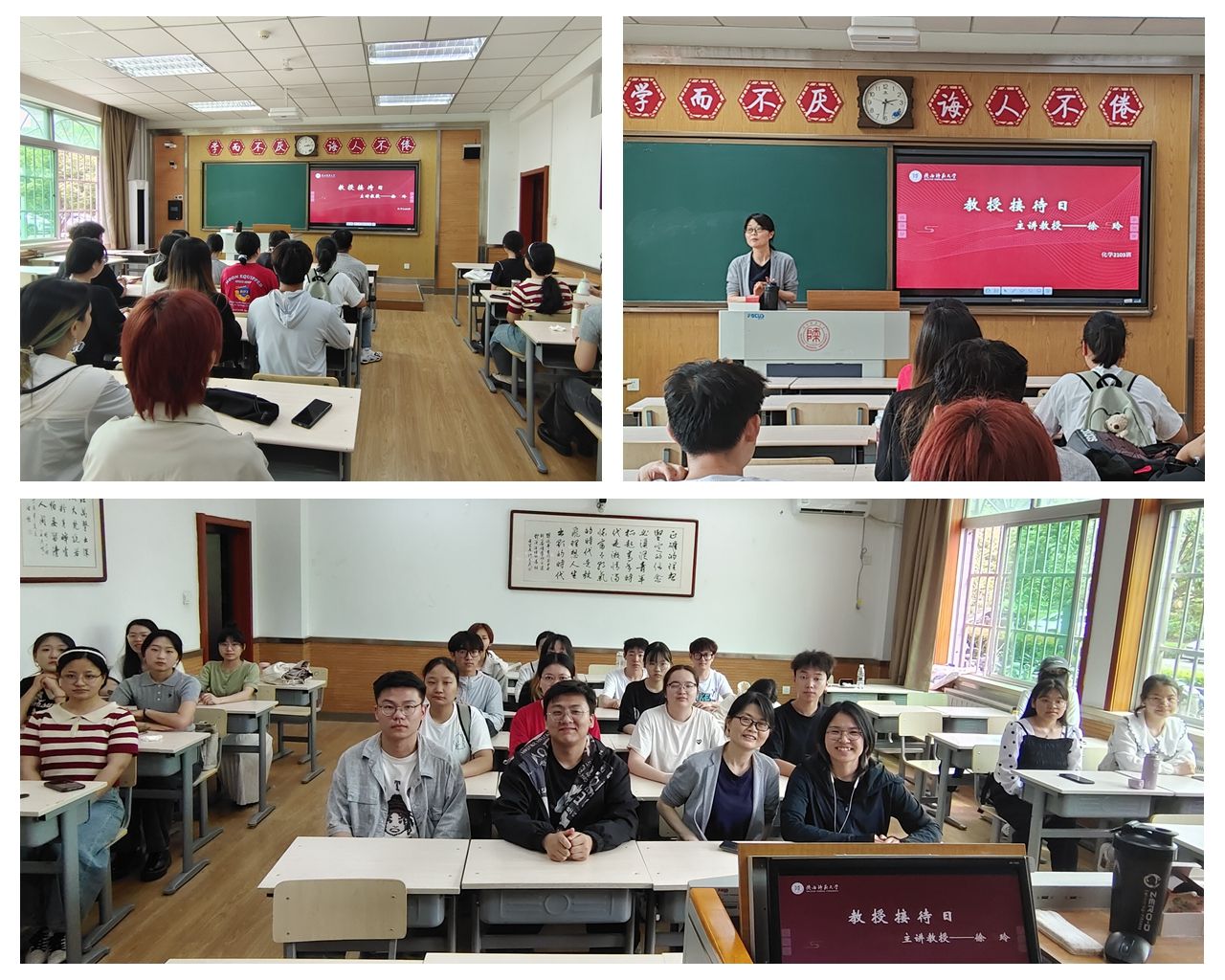 2024年4月19日,化学(优师)2201班邀请刘静教授参加教授接待日活动。刘老师给同学们分享自己的求学经历和工作经历,并就提前收集的问题进行回答。刘老师强调物理化学课程的学习需要将课堂学习和课后做题相结合,做到学练相统一,达到两者的平衡。刘老师提醒同学们要在日常生活中保持自律,不要沉迷网络,有压力不要陷入不必要的精神内耗,要掌握自己排解压力的方法,及时找回状态。刘老师勉励同学们一定要抓紧当下的时间,不断丰富自己的知识储备,为将来的教师生涯做好准备。本次教授接待日的召开,解决了同学们学习生活上的问题,也坚定了同学们立志躬耕教坛的信念。
