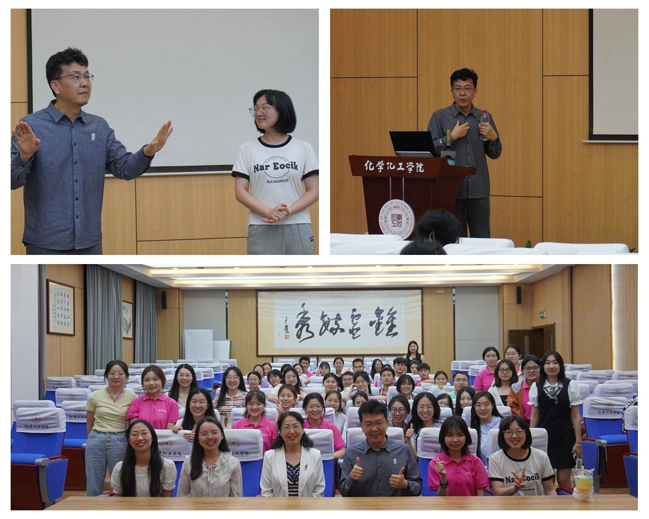 4月26日,2021级化学(卓越教师实验班)邀请新闻与传播学院播音与主持艺术系何明家老师开展“教授接待日”活动,项目主任陈亚芍教授主持。何明家老师以“语言的魅力,沟通的艺术——对提升教师口语水平与教学能力的观念纠偏与策略建议”为题作报告,从教师口语表达技巧、教师口语认知观念纠偏、教师口语策略建议等三个方面为同学们讲述了教师口语表达的重要知识,帮助同学们加强口语表达、提升发声技巧,进一步提升师范生综合素养。