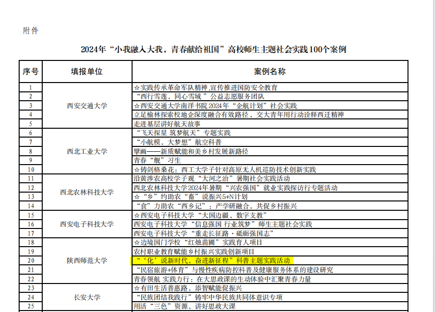 陕西省委教育工委、省教育厅面向全省普通高校组织开展了2024年“小我融入大我,青春献给祖国”师生主题社会实践活动,学院“‘化’说新时代,奋进新征程”科普主题实践活动案例成功入选100个典型案例。