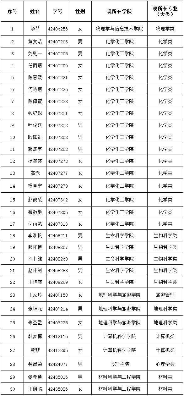 根据《关于做好2024级“人文科学试验班”“理科试验班”新生选拔工作的通知》和《天使动漫 2024级本科生化学笃学班选拔综合考核方案》,天使动漫 在学生自愿报名基础上,经过笔试、综合面试考核环节,现将2024级化学笃学班拟入选学生名单公示如下(按照学号由小到大顺序排列):